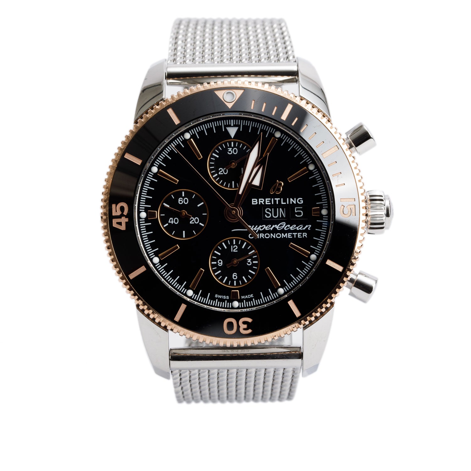 Stainless Steel & 18k Rose Gold Superocean Heritage Chronograph 44 MM Automatic Watch Black Dial U13313 w/ Box & Papers