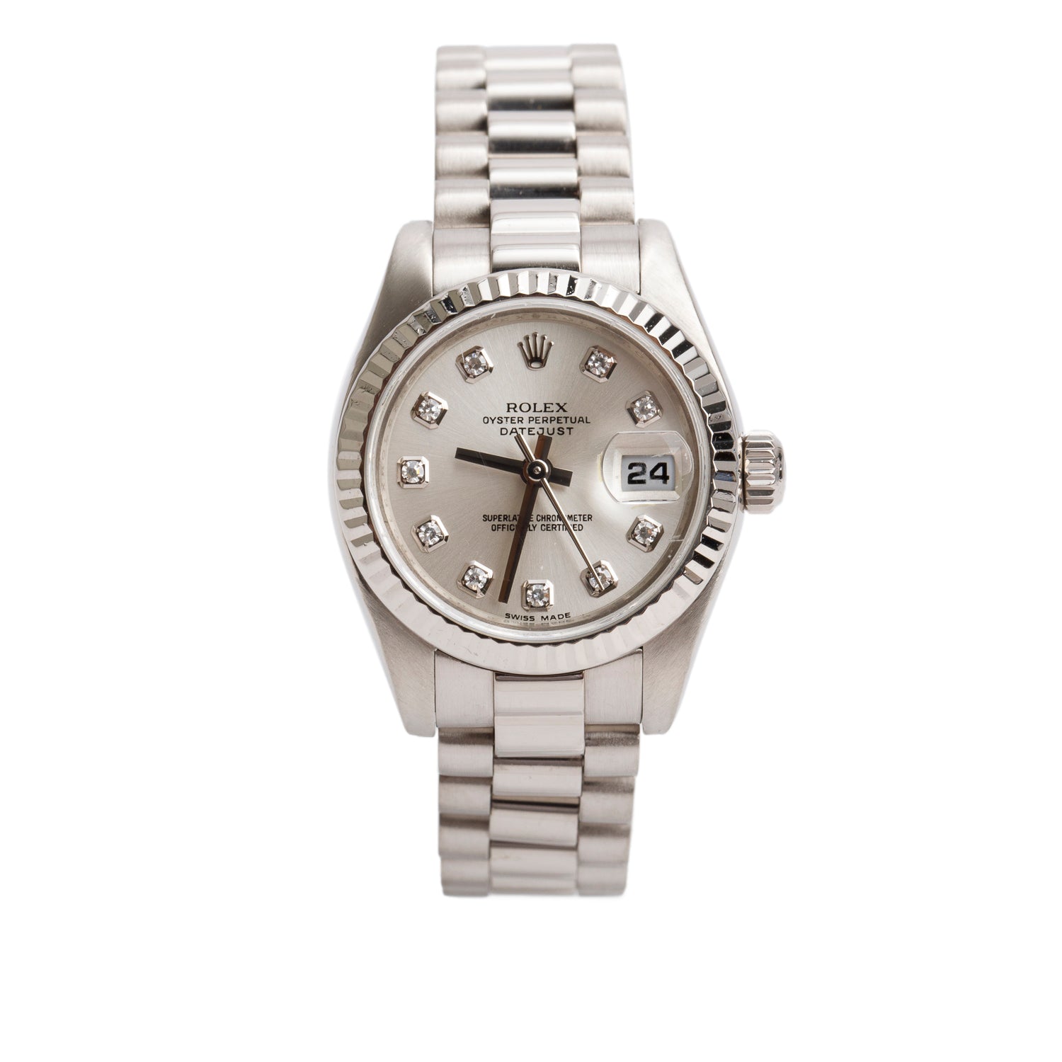 18k White Gold Lady-Datejust President 26 MM Automatic Watch Silver Diamond Dial 179179 w/ Box