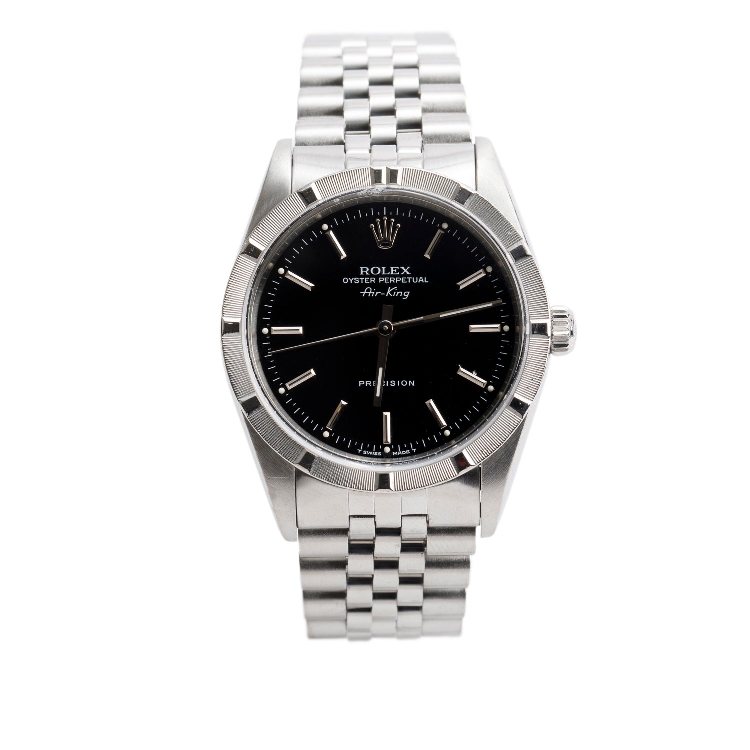 Stainless Steel Oyster Perpetual Engine Turned Bezel Air King 34 MM Watch Black Dial 14010