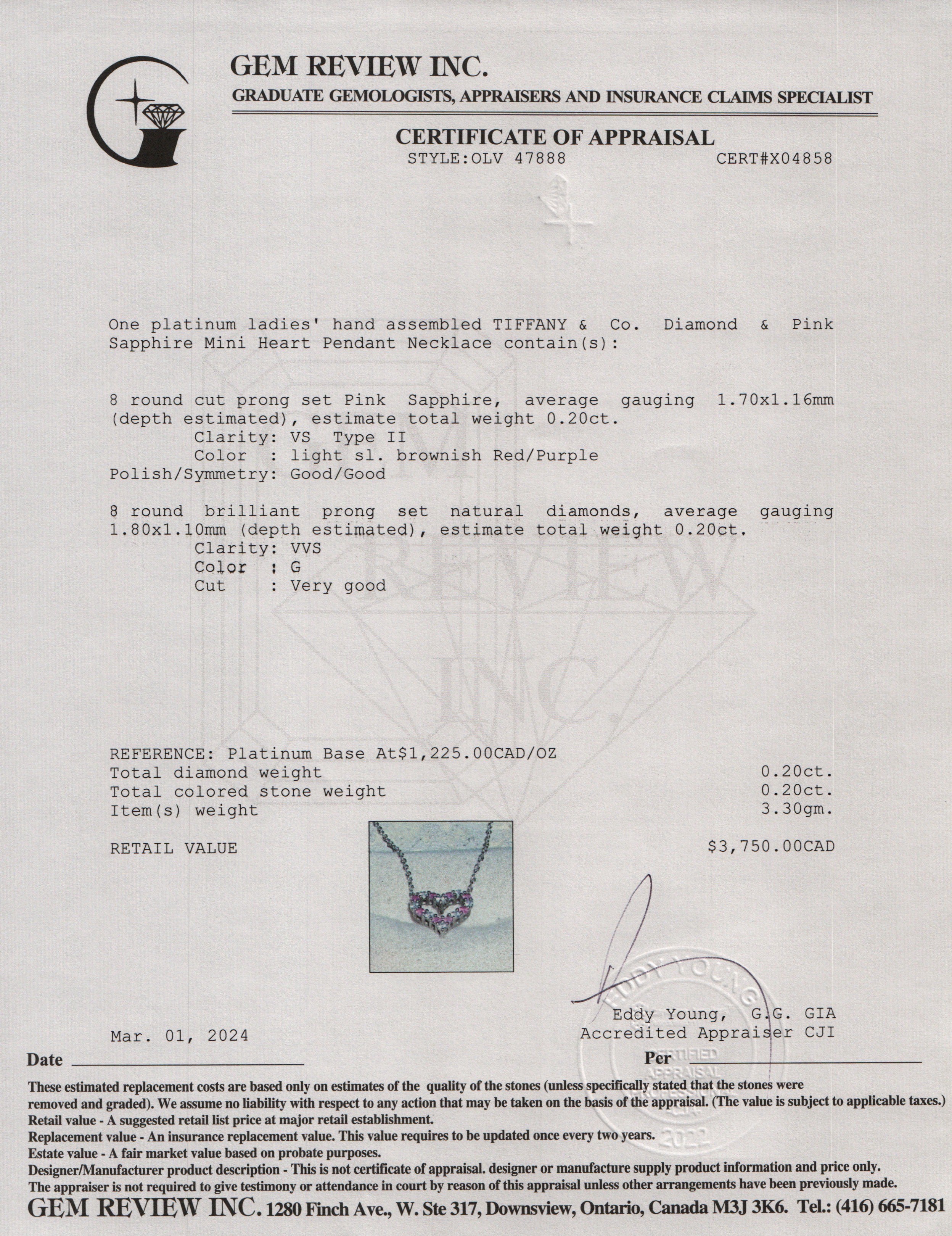Platinum Diamond & Pink Sapphire Mini Heart Pendant Necklace w/ Box