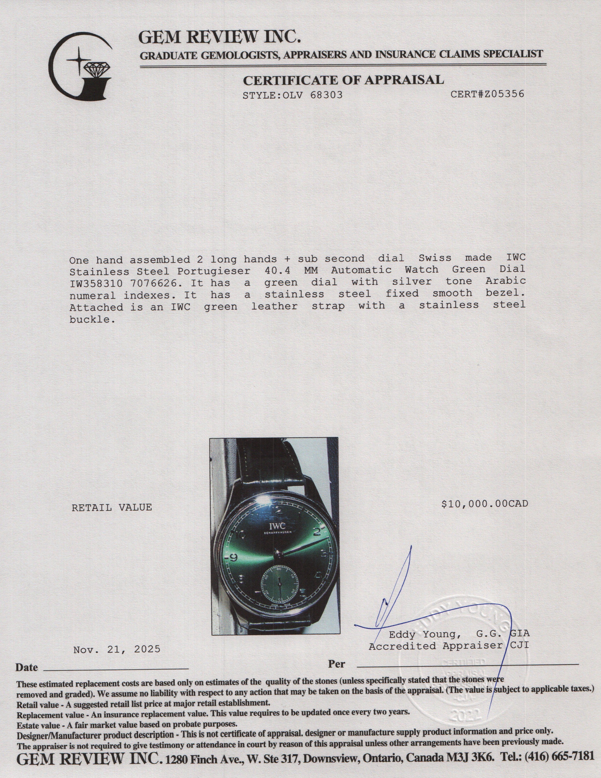 Stainless Steel Portugieser 40.4 MM Automatic Watch Green Dial IW358310