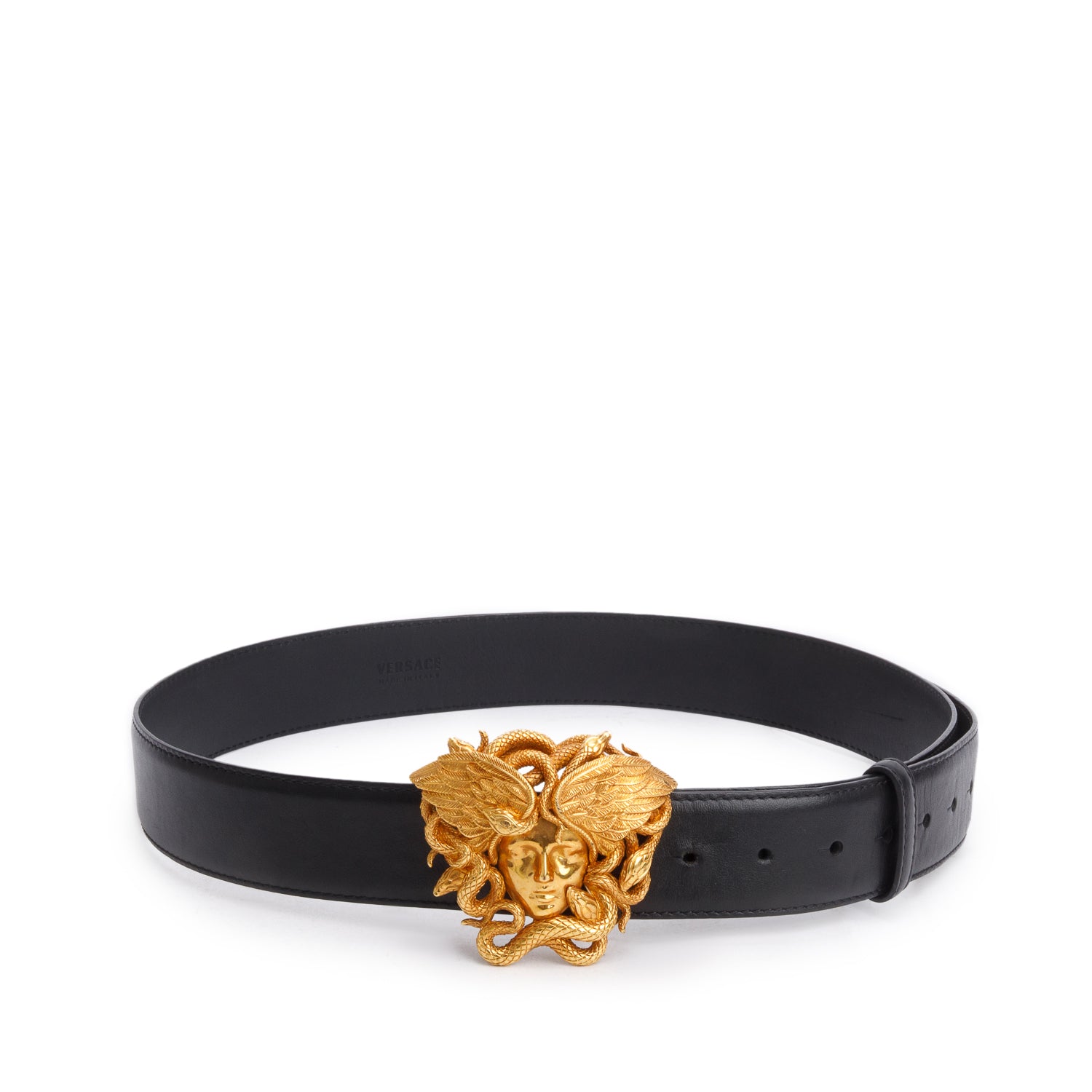 Condition: Very Good; some scratches and creasing at leather; minor tarnishing at buckle.