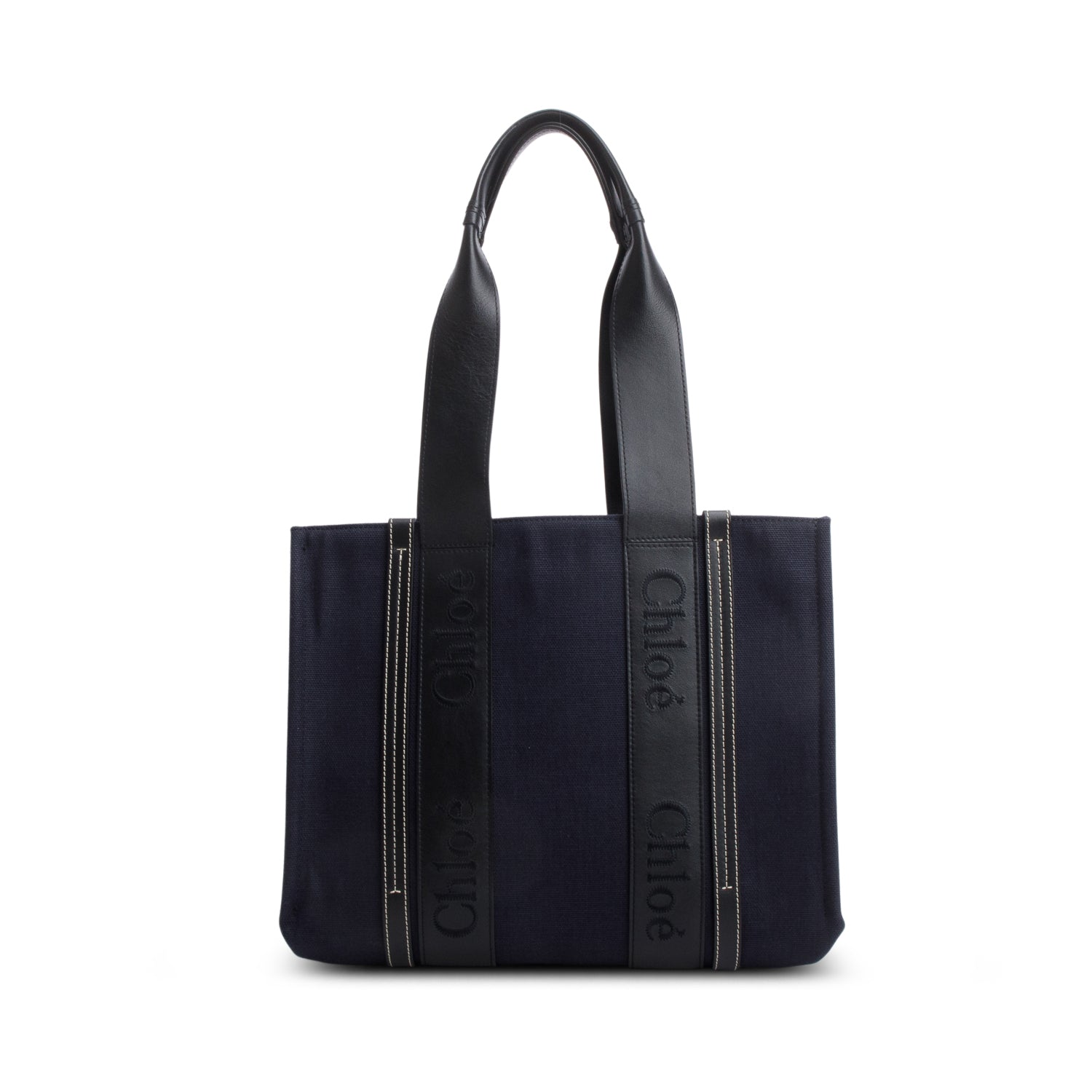 Blue Calfskin Linen Medium Denim Woody Tote Bag