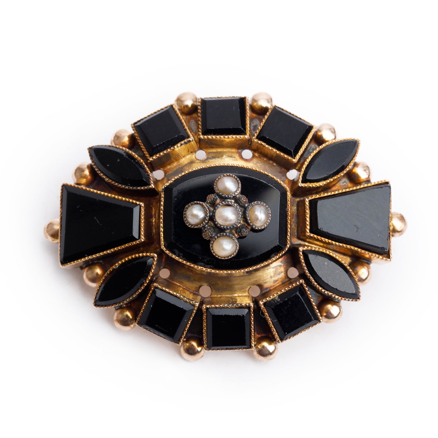 Antique 9k Yellow Gold Seed Pearl & Black Crystal Pendant Brooch