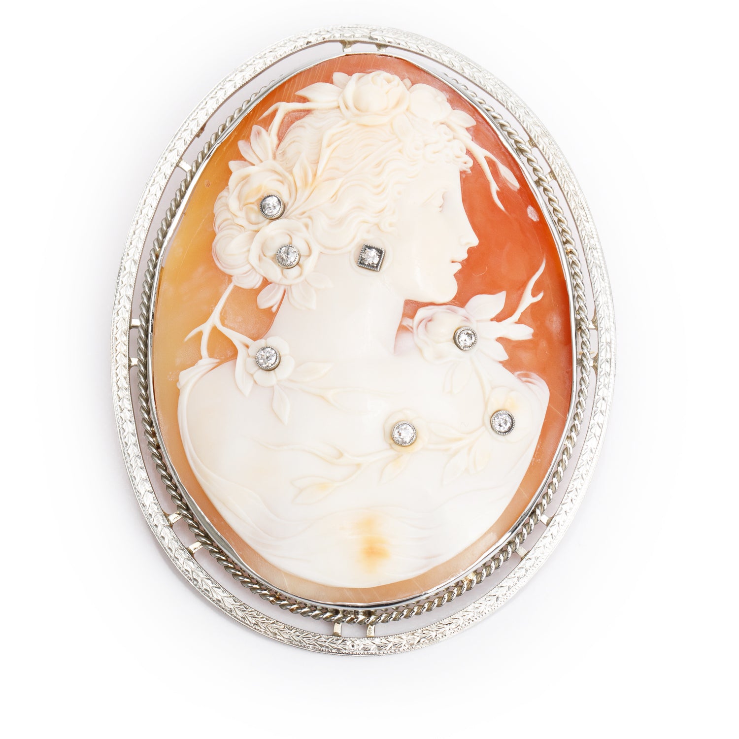Antique 10k White Gold Diamond Lady Shell Cameo Brooch