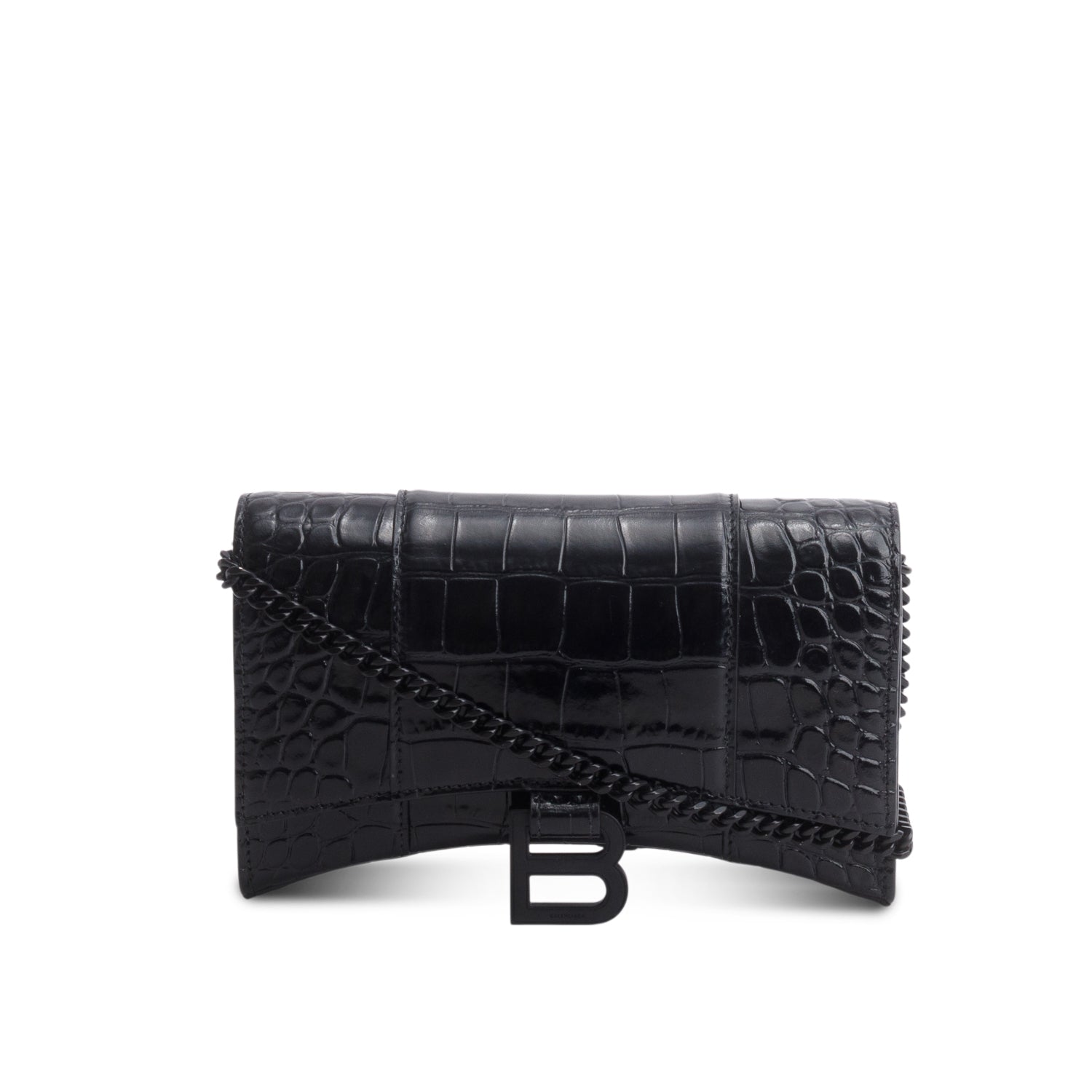 Black Shiny Croc Embossed Calfskin Monochrome Hourglass Wallet on Chain