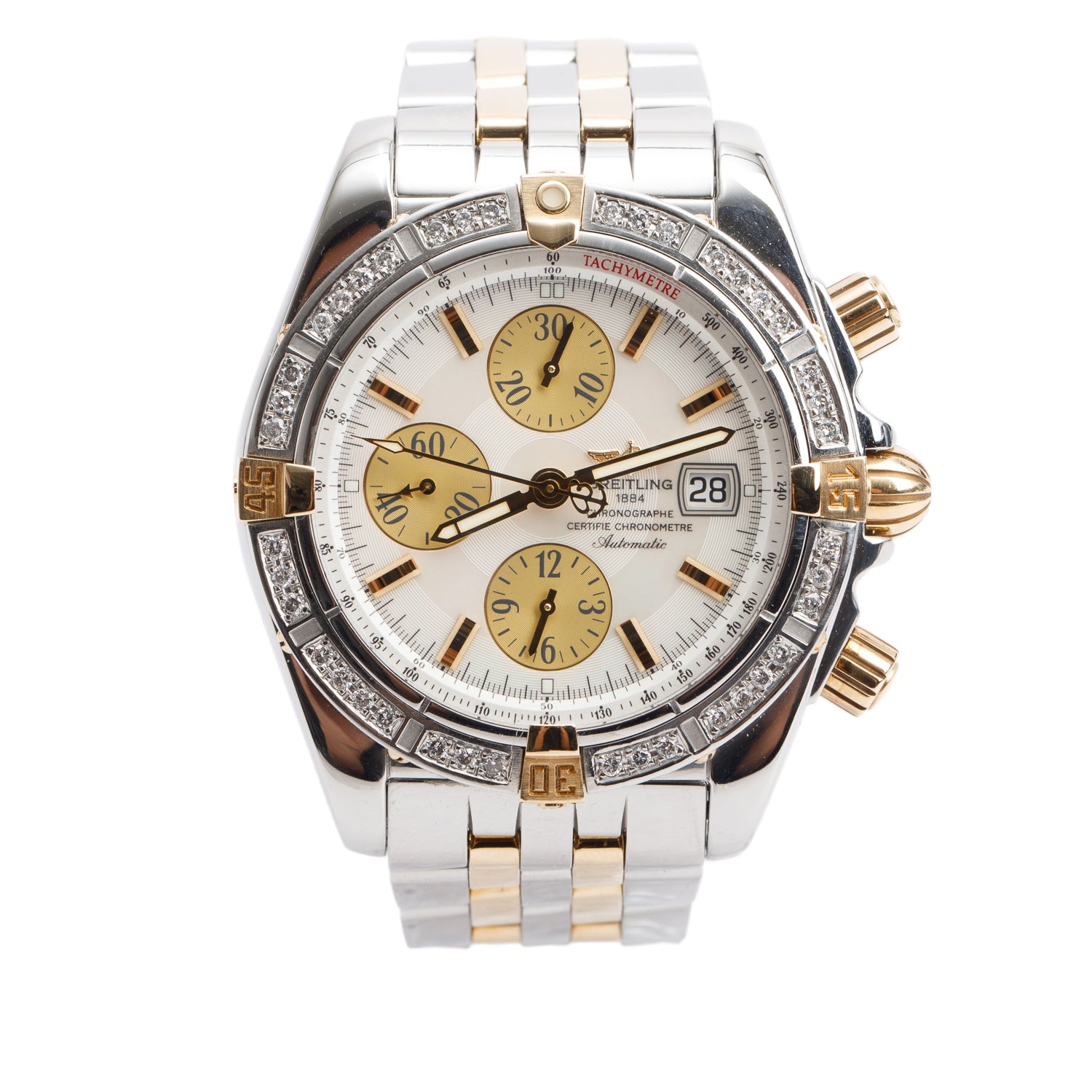 Stainless Steel & 18k Yellow Gold Diamond Bezel Chronomat Evolution 44 MM Automatic Chronograph Watch Mother of Pearl Dial B13356 w/ Box