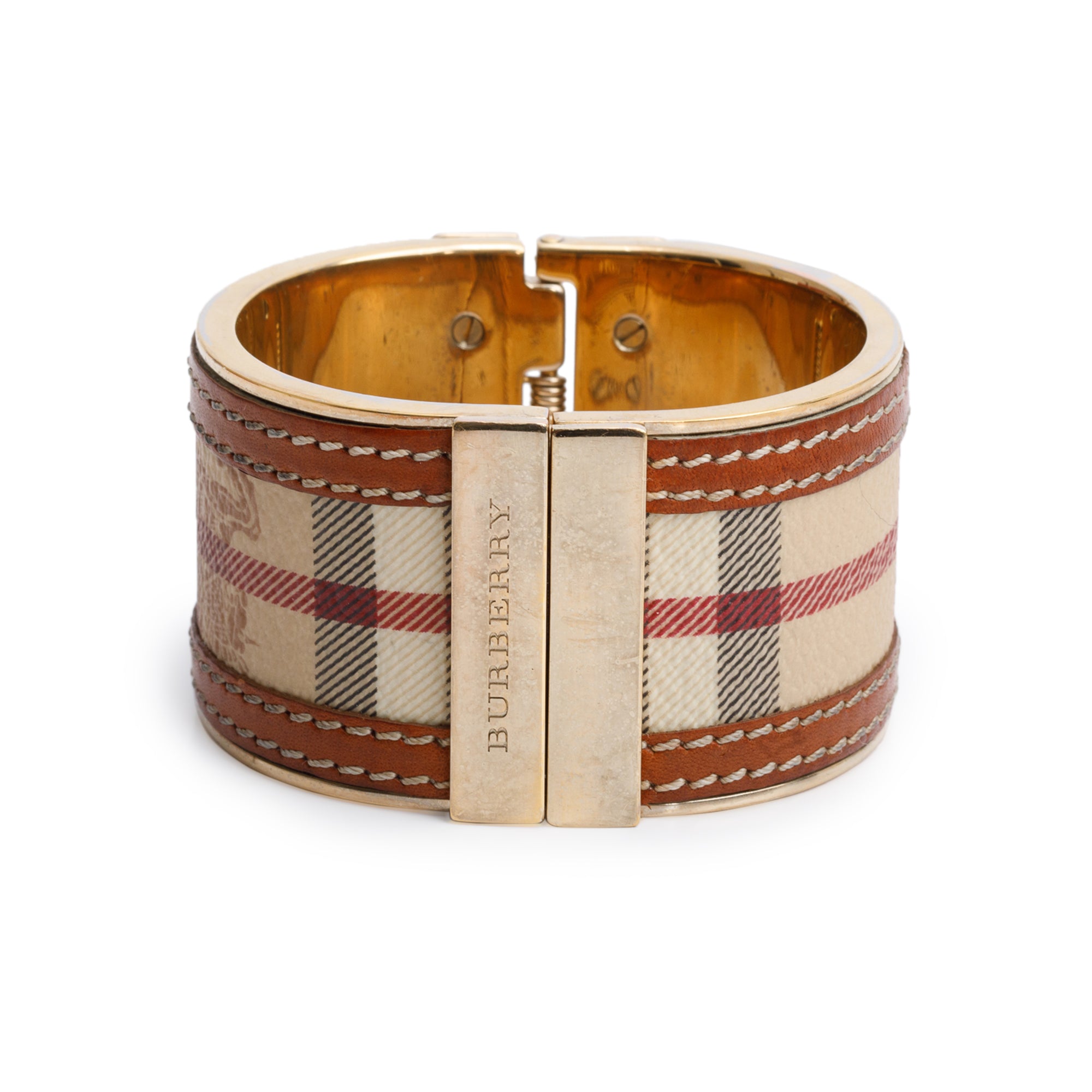 Gold-Tone Metal Check Leather Hinged Wide Bangle Bracelet
