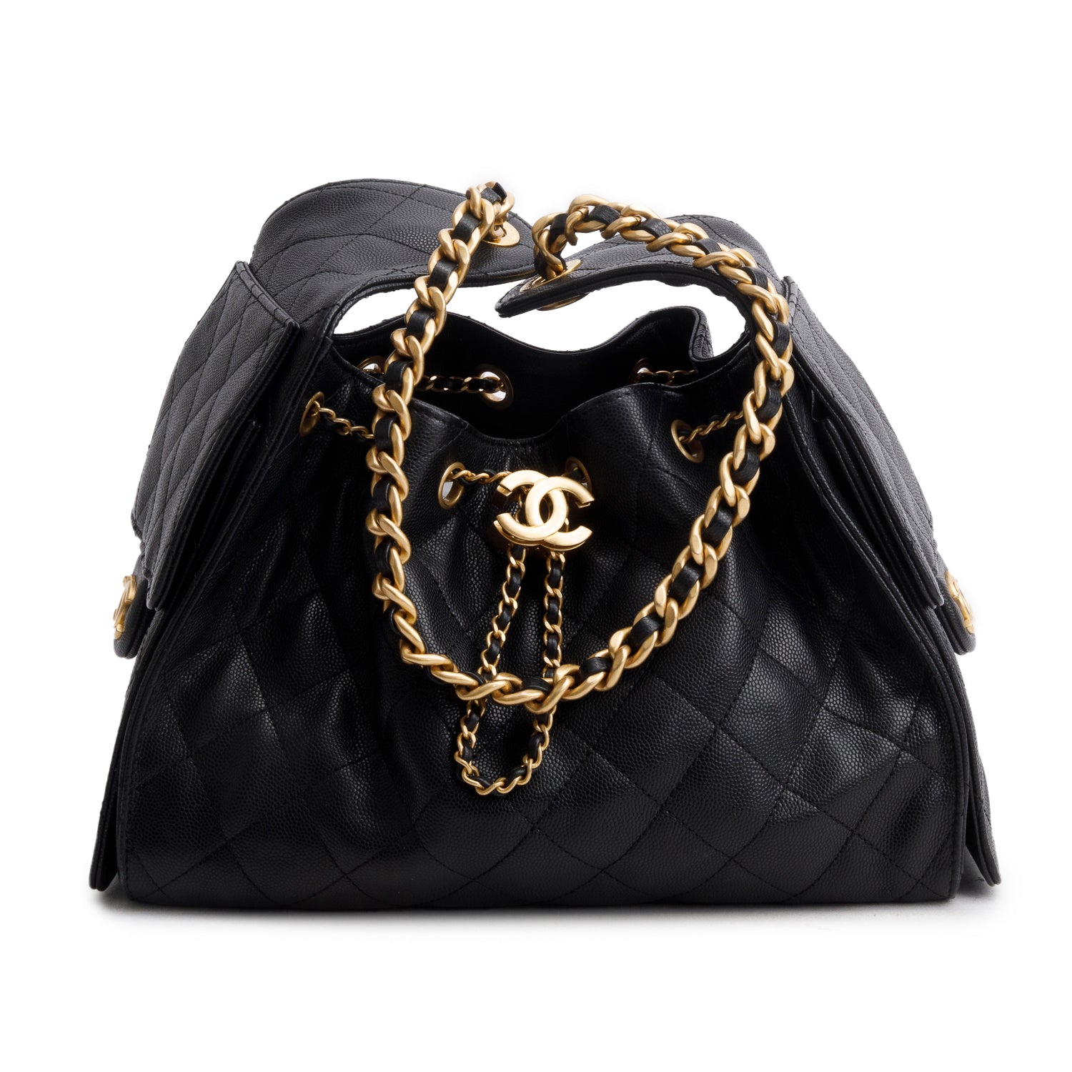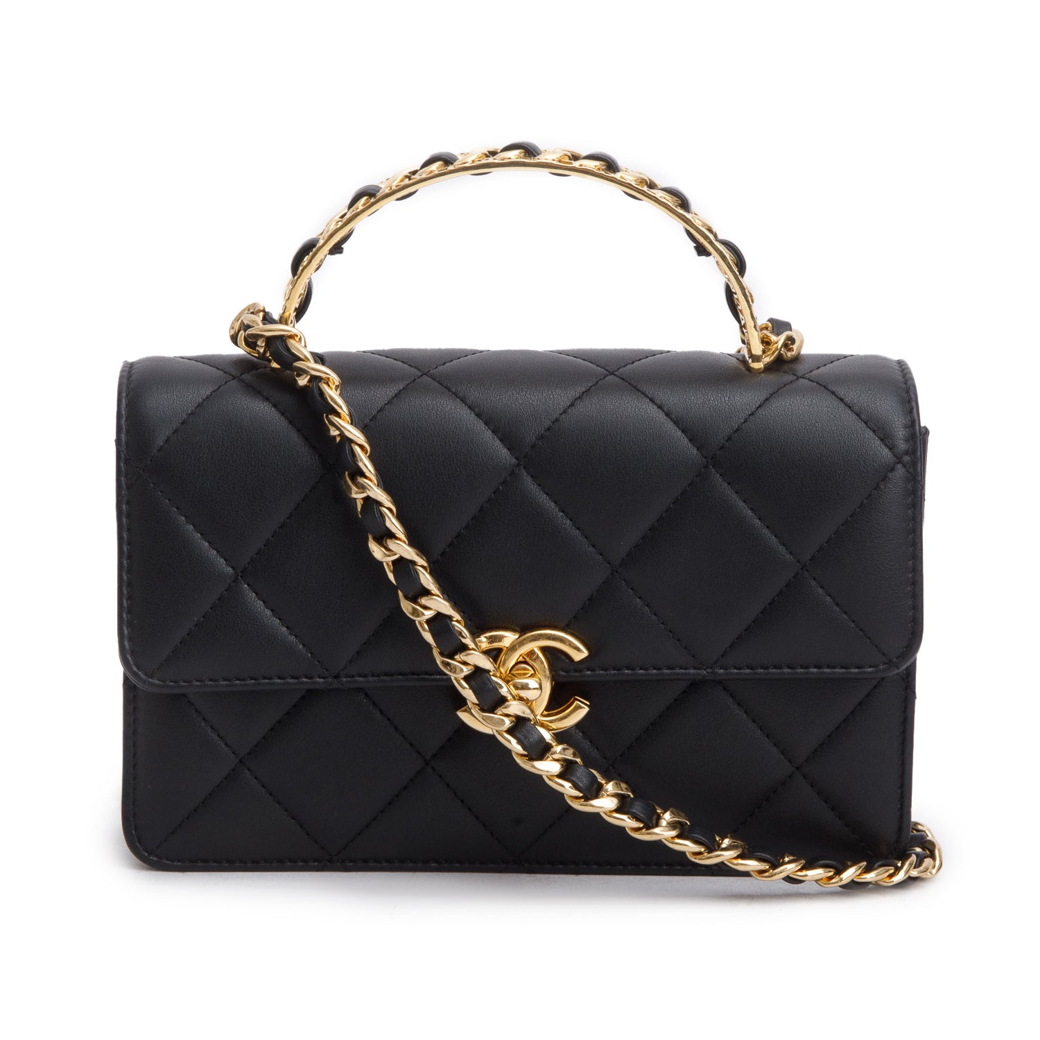 Black Lambskin Quilted Chain Logo Top Handle Flap Bag