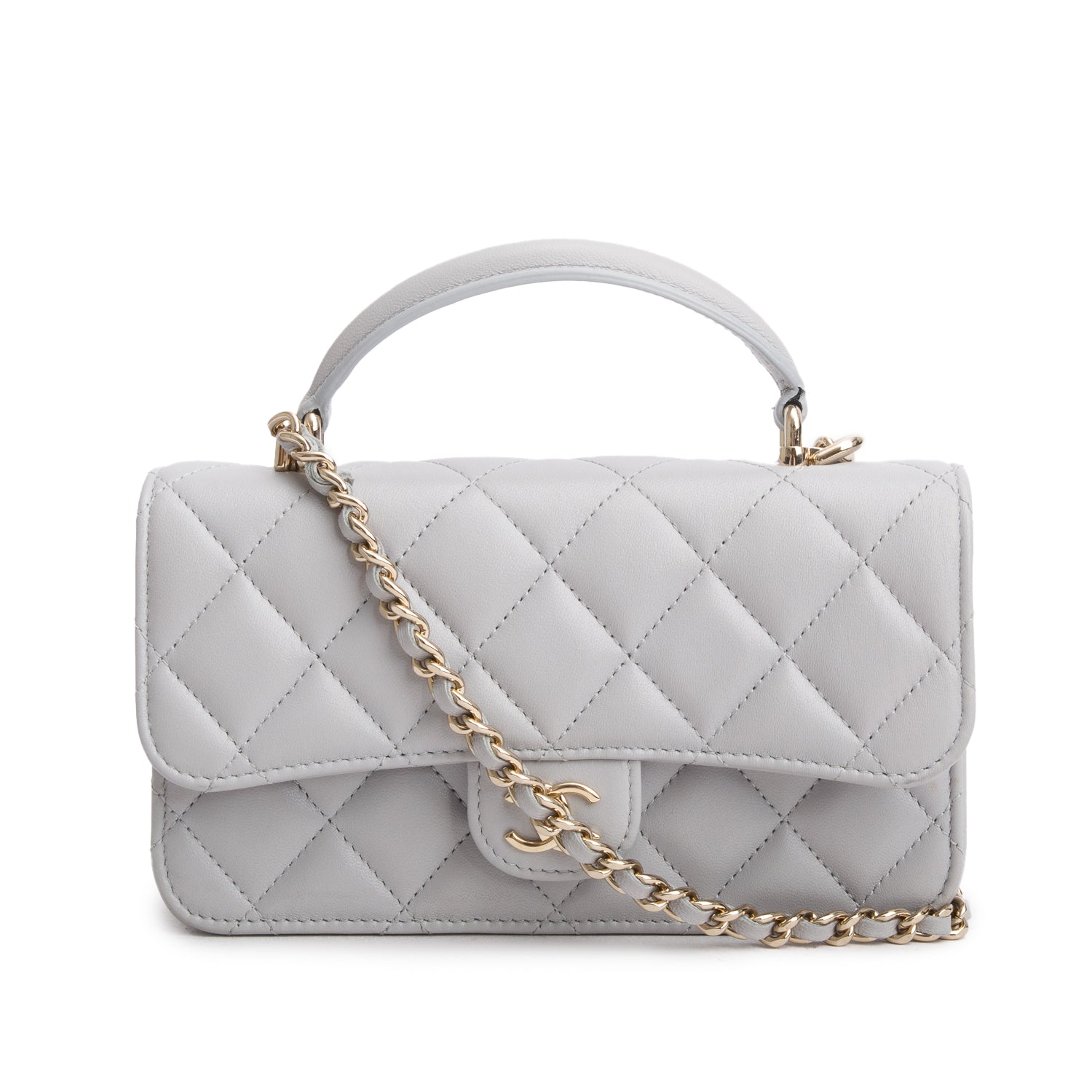 2025 Grey Lambskin Quilted Flap Phone Holder with Chain w/ Box & Receipt