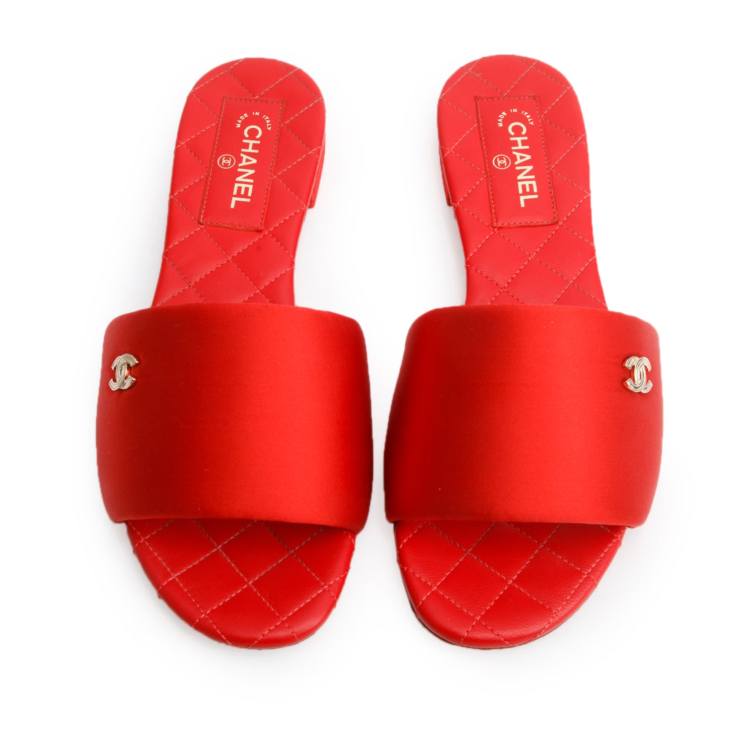 Red Satin Quilted Calfskin Leather CC Logo Slides, Size 38 w/ Box