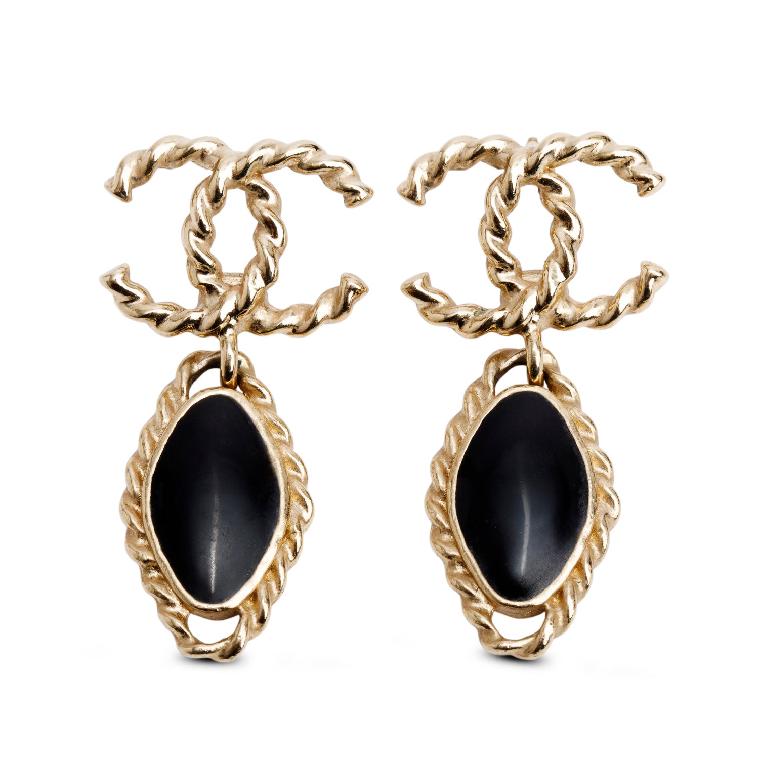 2024 Gold-Plated Black Gripoix Glass CC Drop Earrings w/ Box