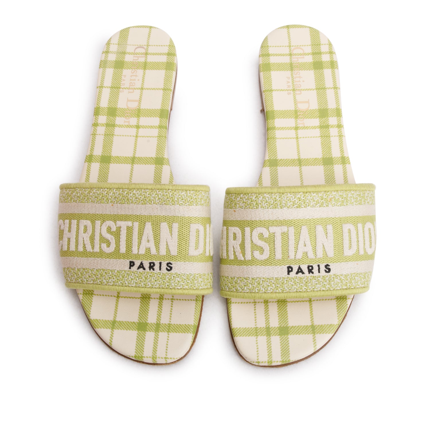 2021 Green Canvas Check'N'Dior Pop Embroidered Dway Flat Slide Sandals, Women's Size 36.5 w/ Box