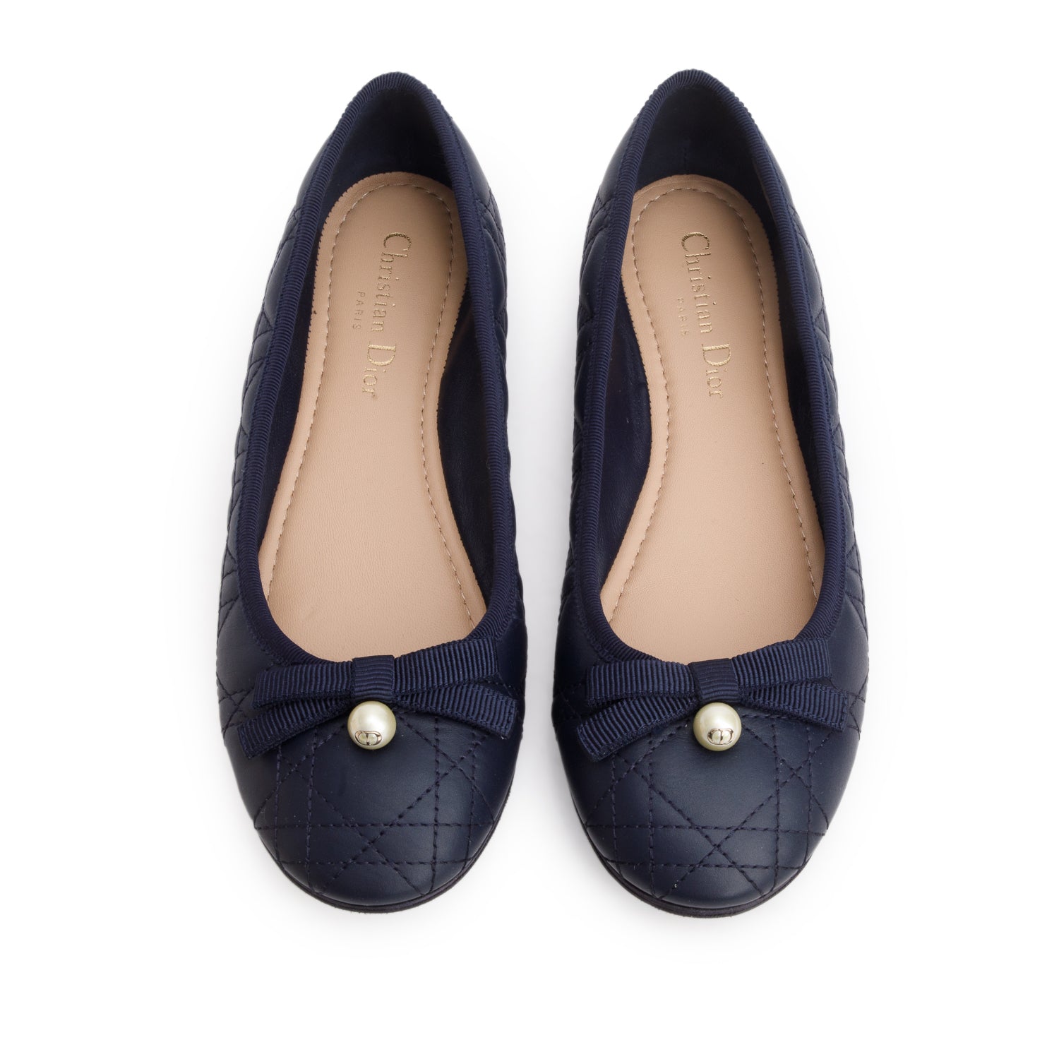 Navy Calfskin Leather Quilted Cannage Ballet Flat, Size 37.5 w/ Box