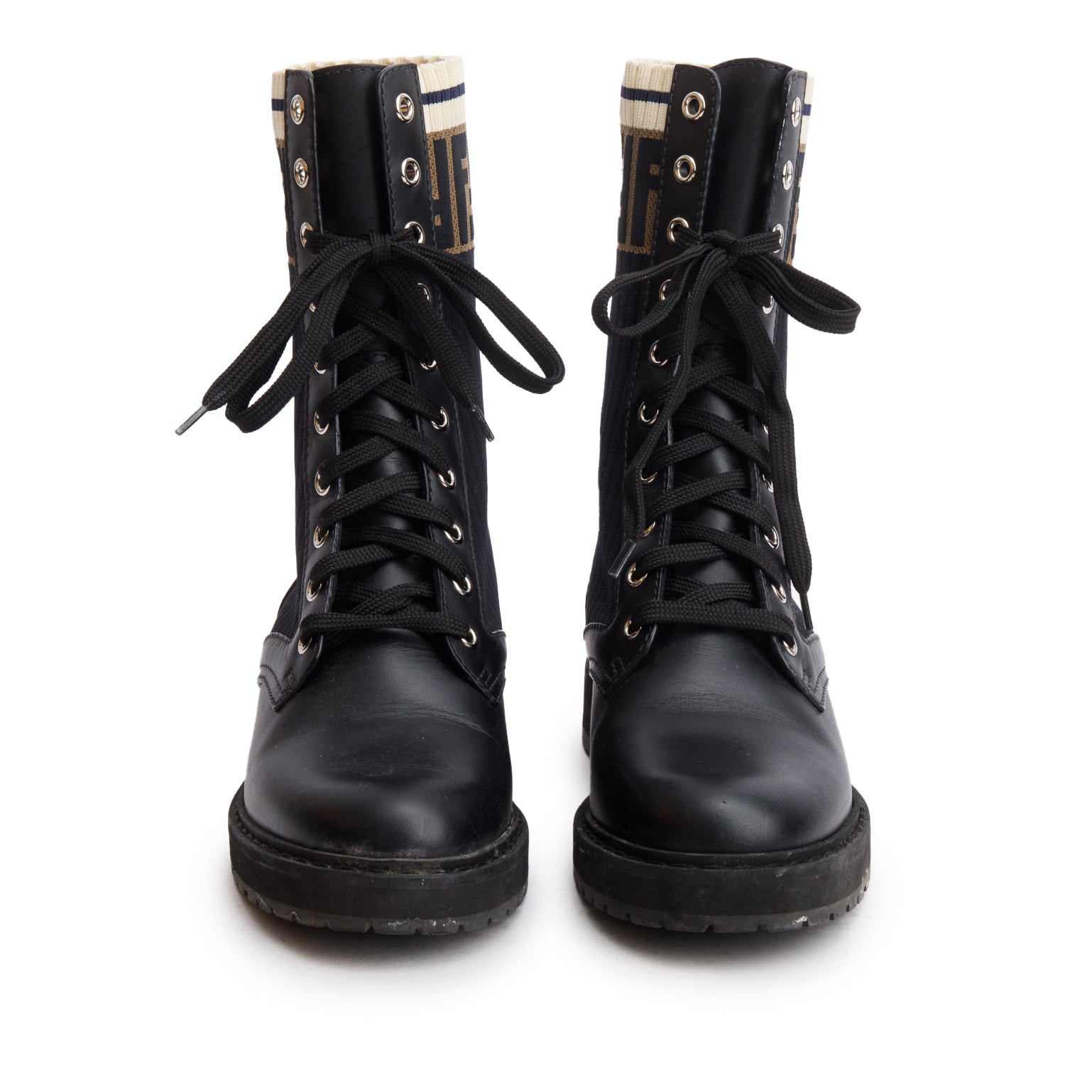 Brown Leather FF Logo Stretch Knit Over the Knee Rockoko Sock Boots, Size 37