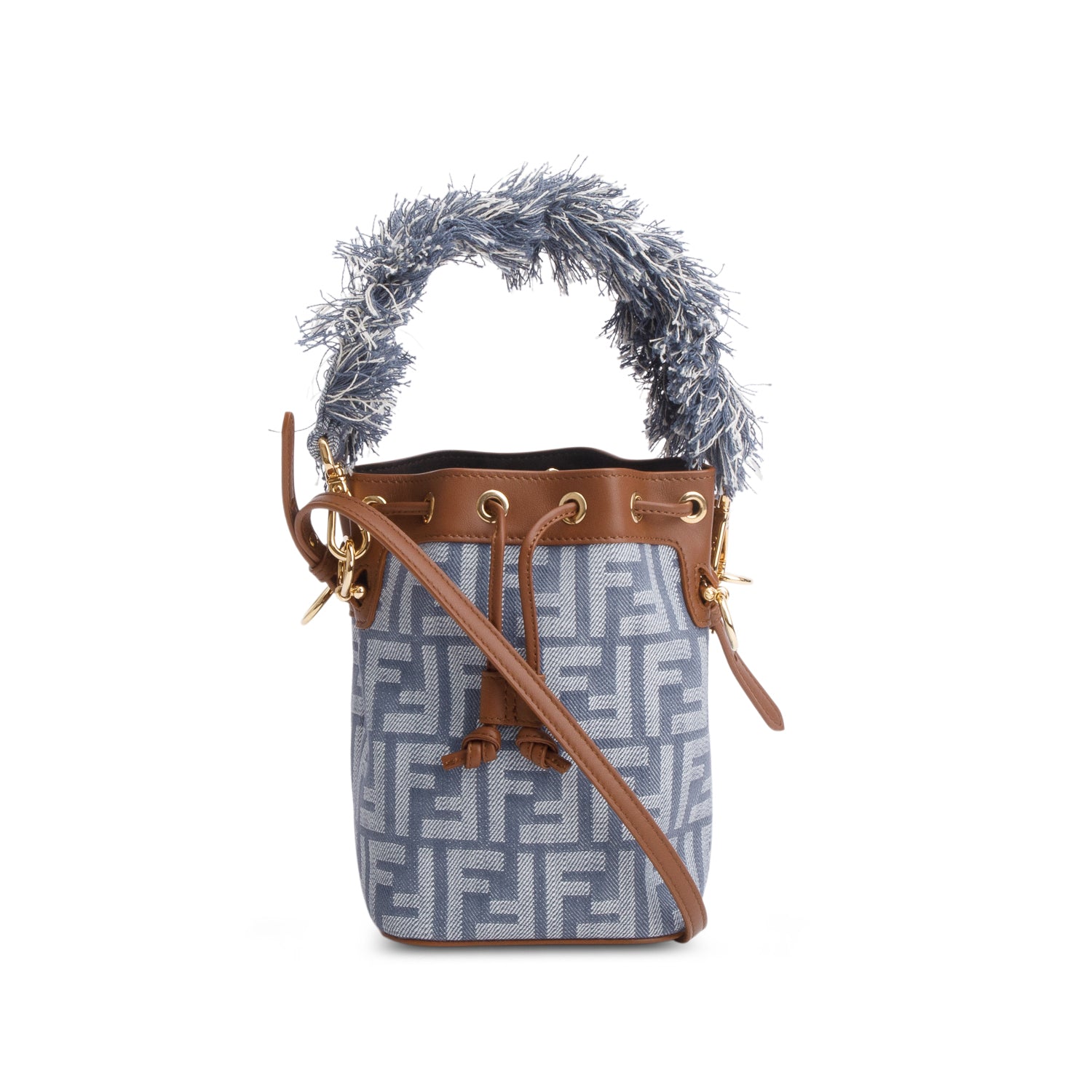 Blue Denim Effect Fabric FF Jacquard Vitello Mini Mon Tresor Bucket Bag w/ Straps