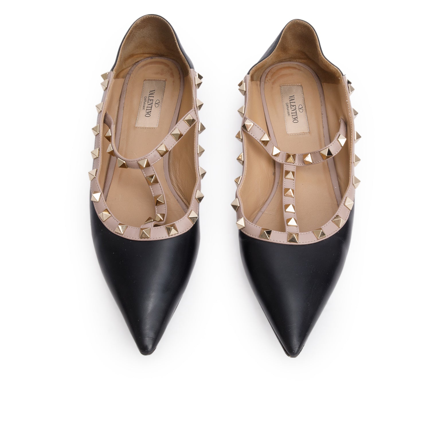 Black Nappa Leather Rockstud Caged Ballet Flats, Size 39