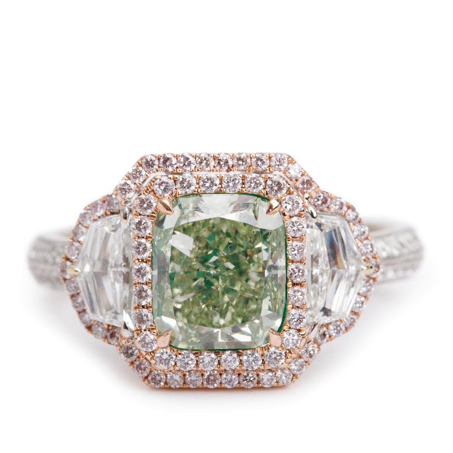 Effy 2023 14k White and Rose Gold 3.02 ct. Cushion Shaped Natural Green Diamond Cocktail Ring, Size 9.25 w/ Box, Receipt & GIA Report
