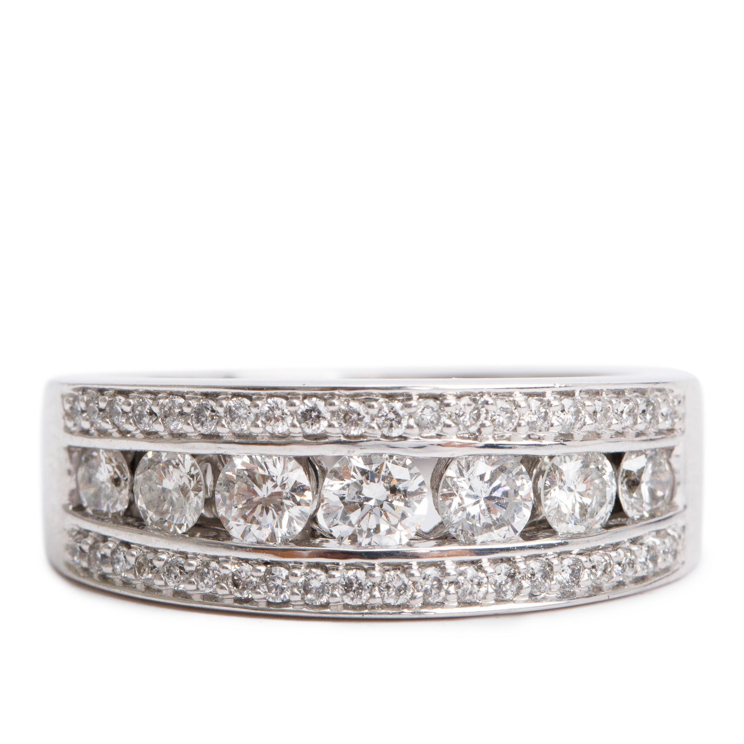 14k White Gold Three-Row Diamond Band Ring, Size 7