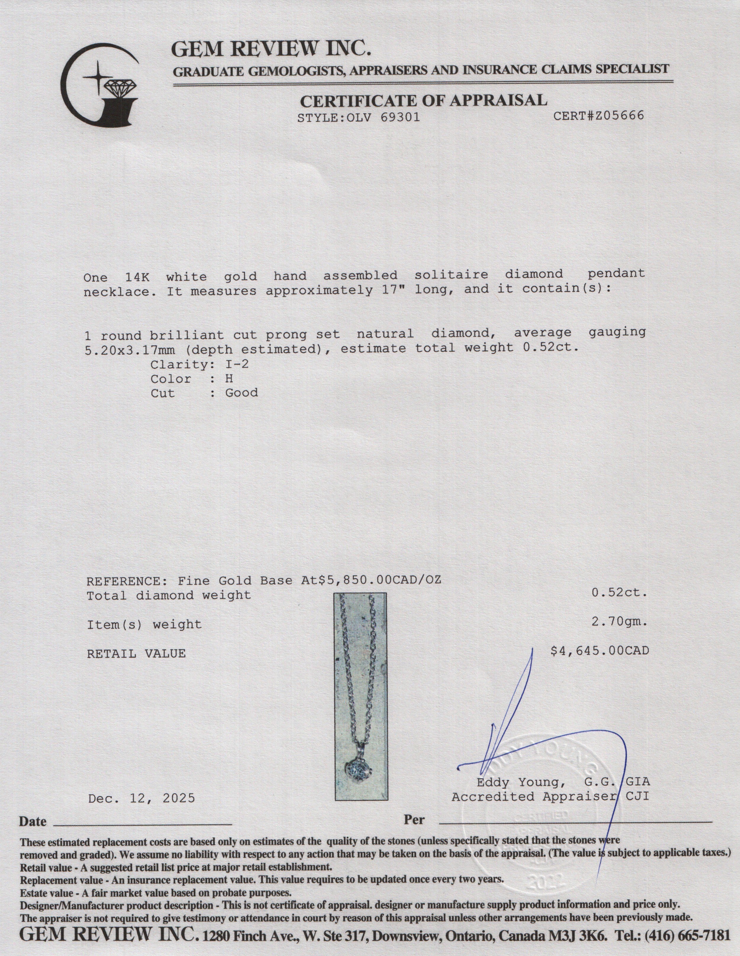 14k White Gold 0.52 ct. Diamond Solitaire Pendant Necklace