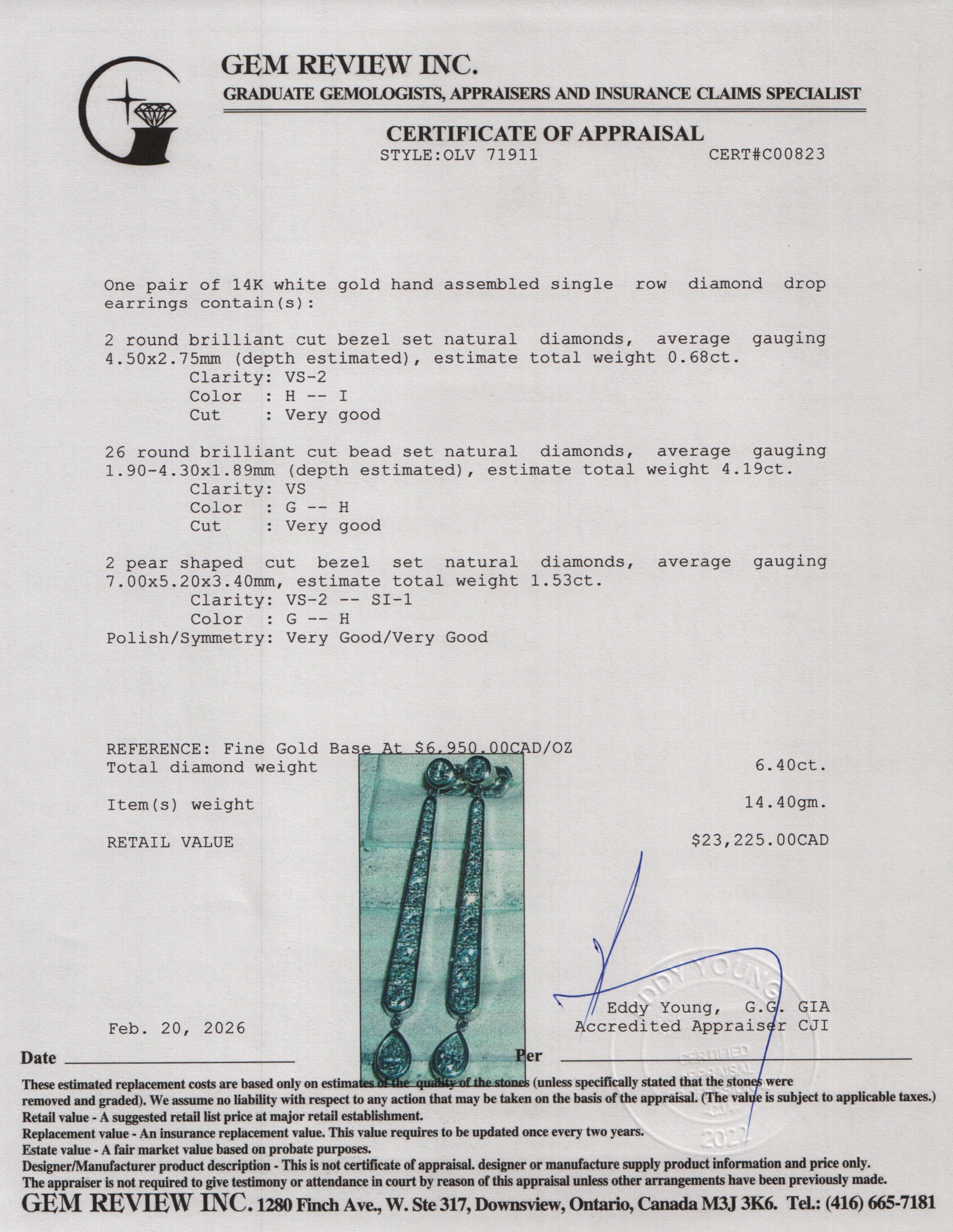 14k White Gold 6.40 tcw. Diamond Drop Earrings