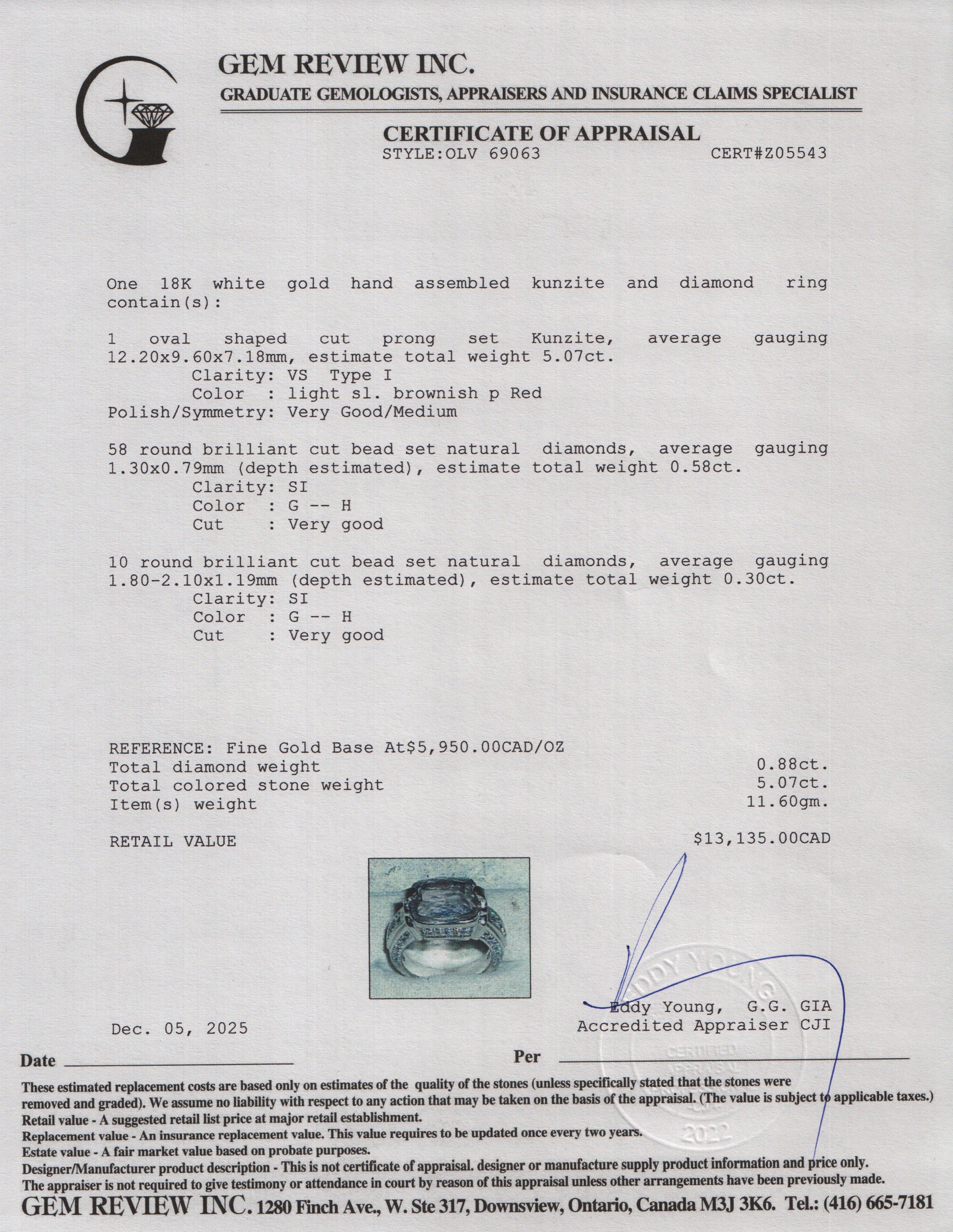 18k White Gold Kunzite and Diamond Cocktail Ring, Size 6.25