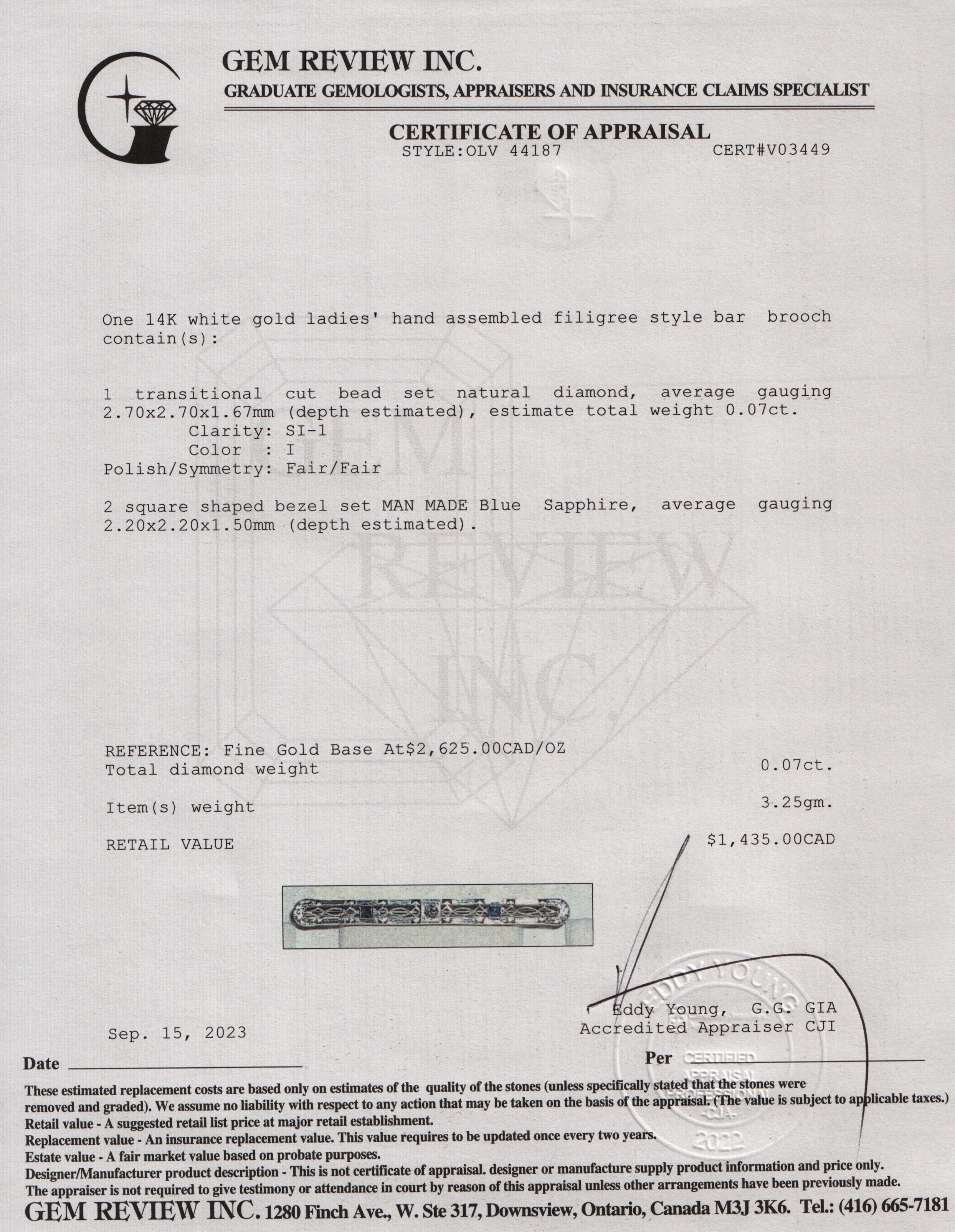Antique 14k White Gold Diamond Filigree Bar Brooch