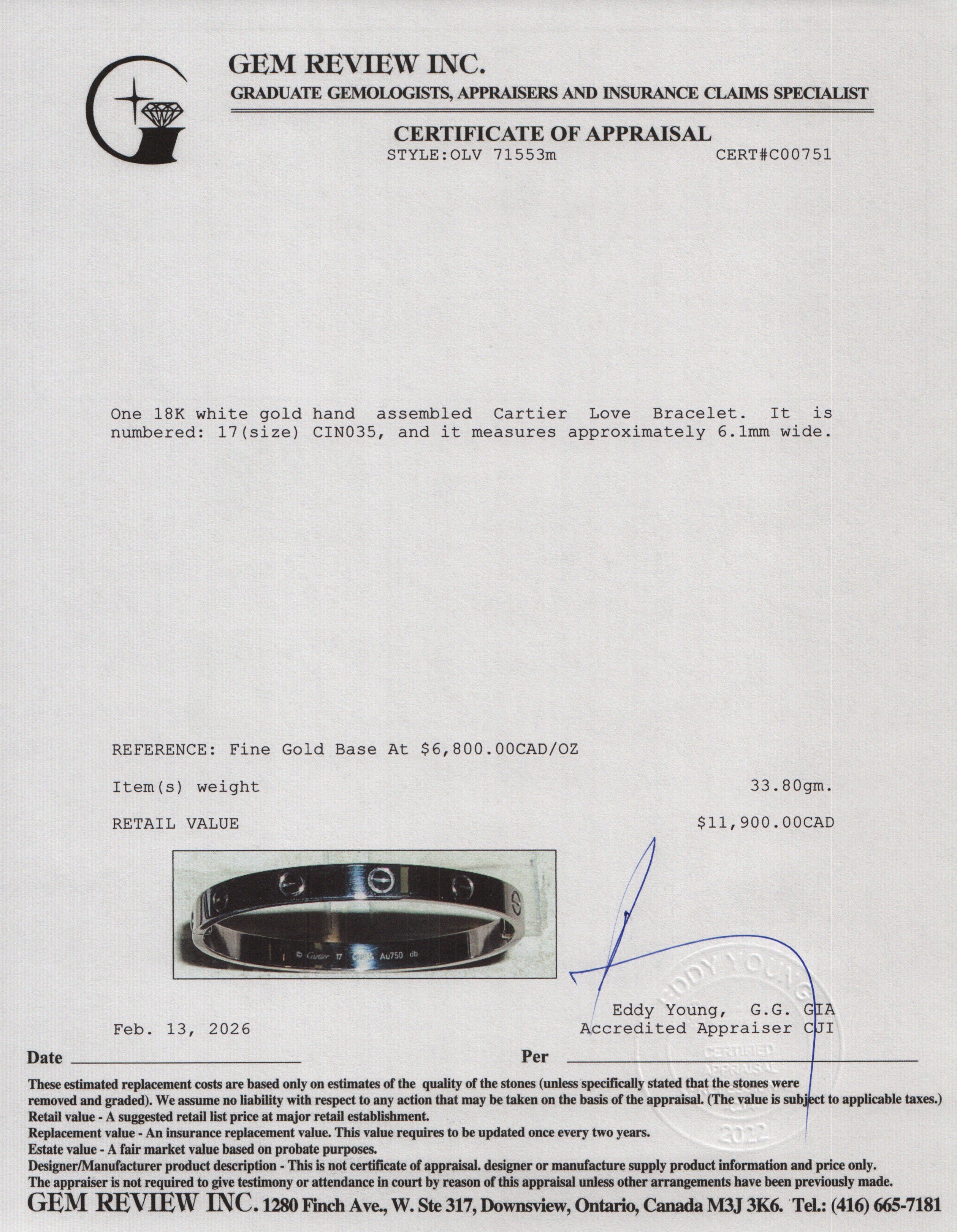 18k White Gold Love Bracelet, Classic Model, Size 17 w/ Pouch & Certificate