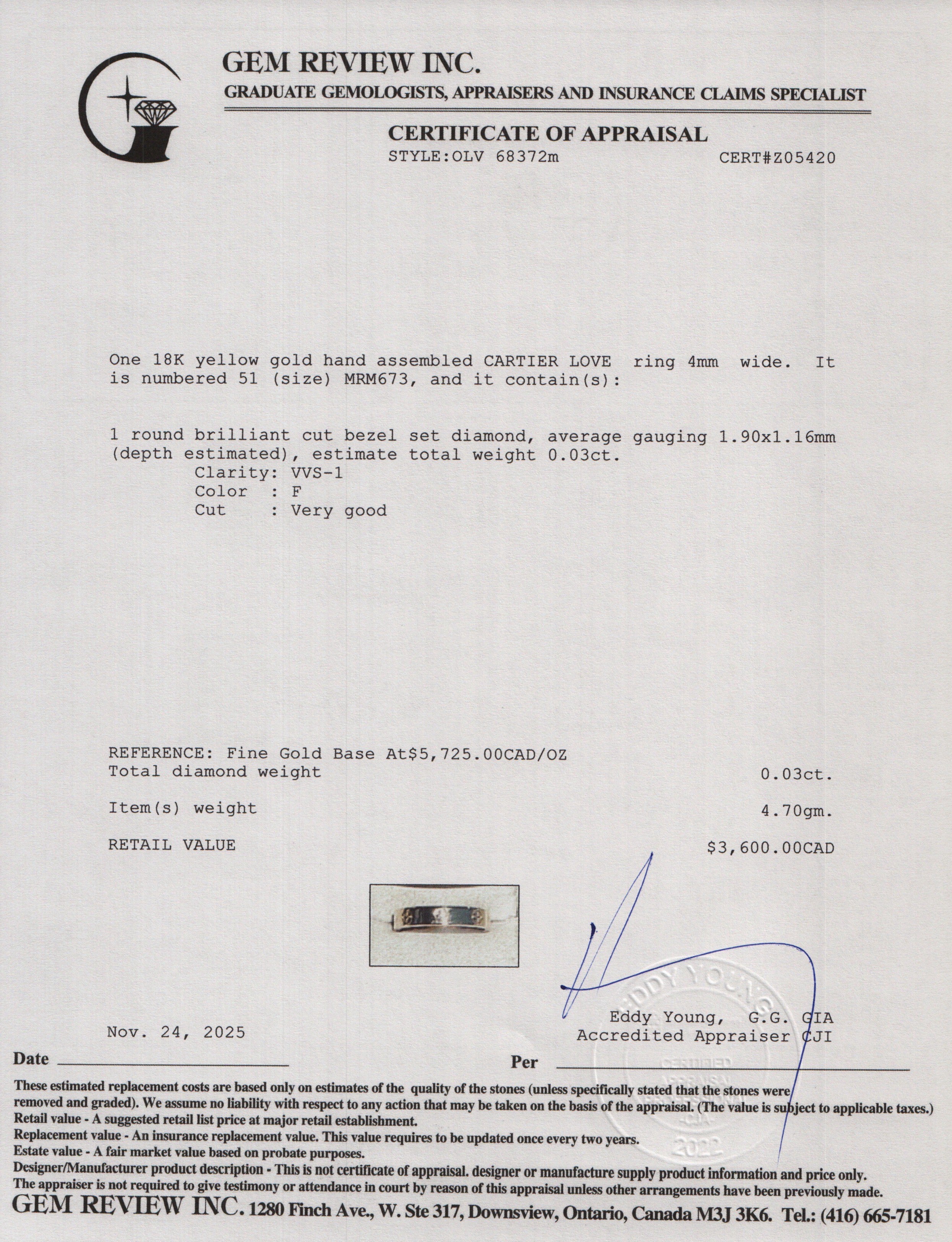 2021 18k Yellow Gold 1 Diamond 4 MM Love Wedding Band Ring, Size 51 5.5 w/ Box & Certificate