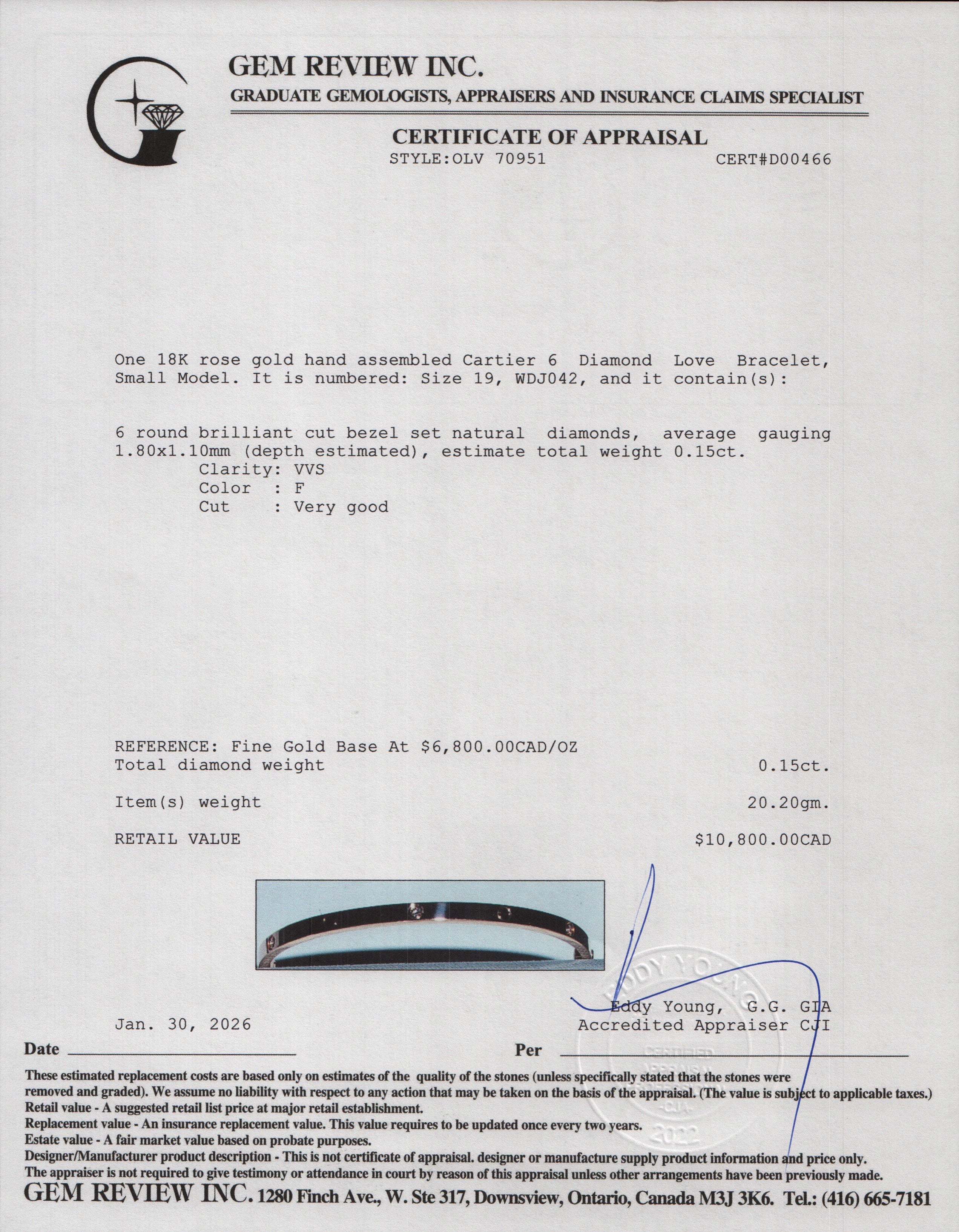 2024 18k Rose Gold 6 Diamond Love Bracelet, Small Model, Size 19 w/ Box & Certificate