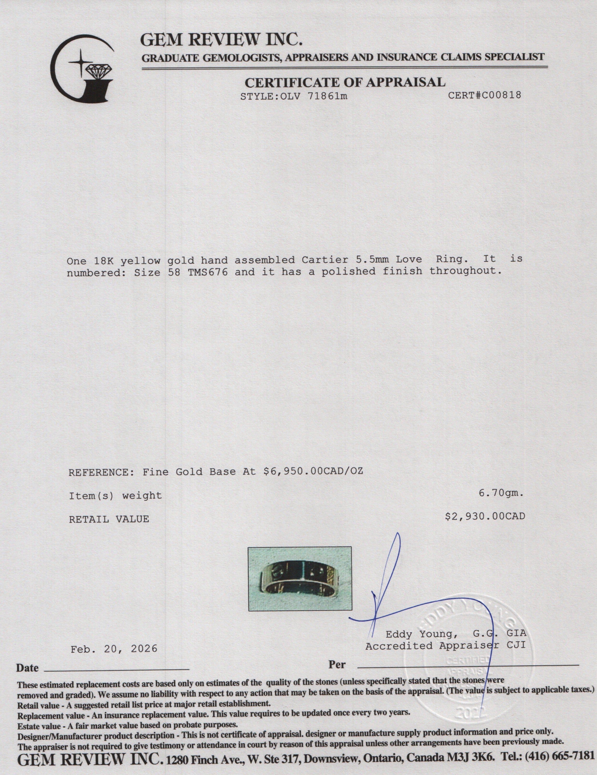 2024 18k Yellow Gold 5.5 MM Love Ring, Classic Model, Size 58 8.25
