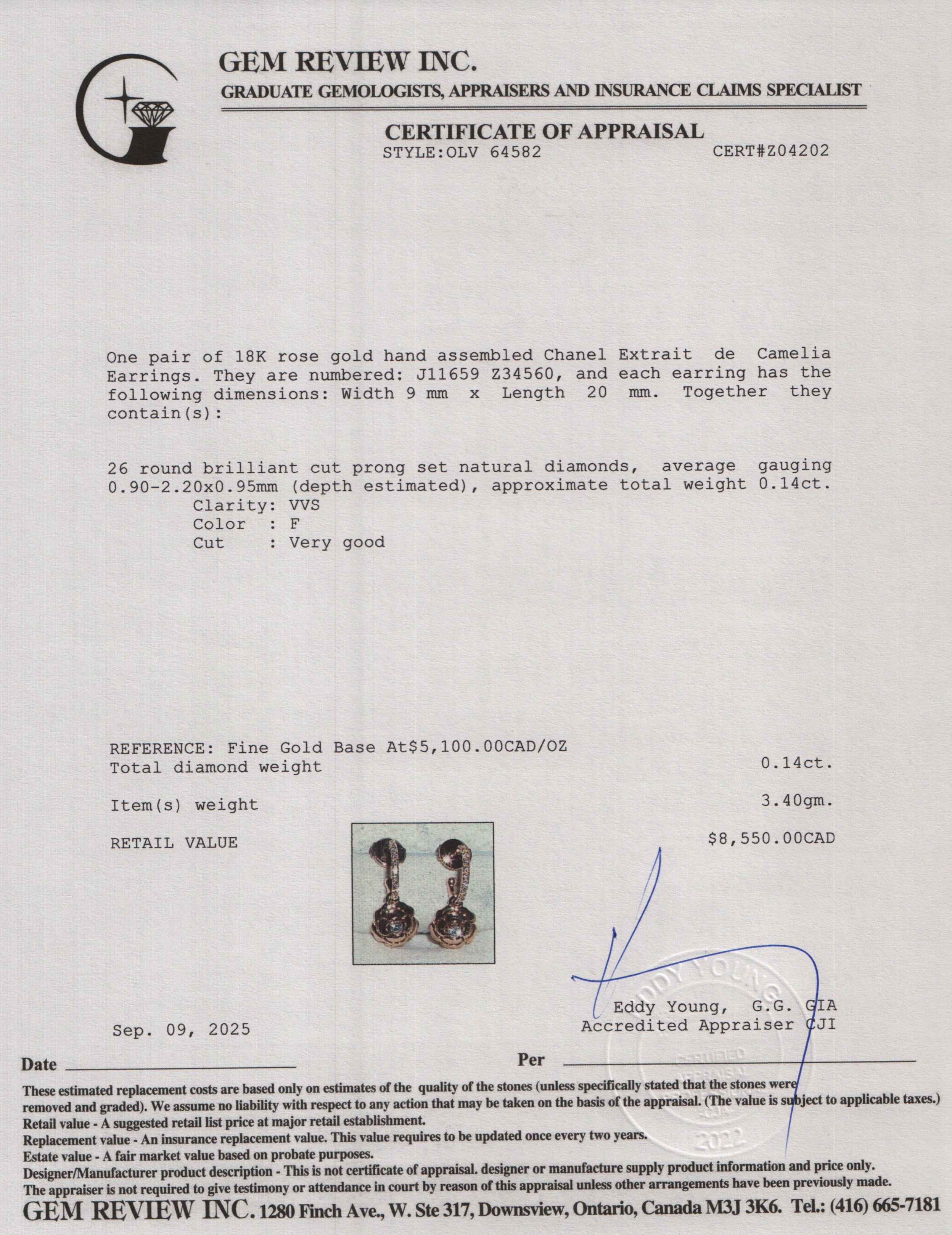 18k Rose Gold Diamond Extrait de Camelia Earrings w/ Box & Certificate