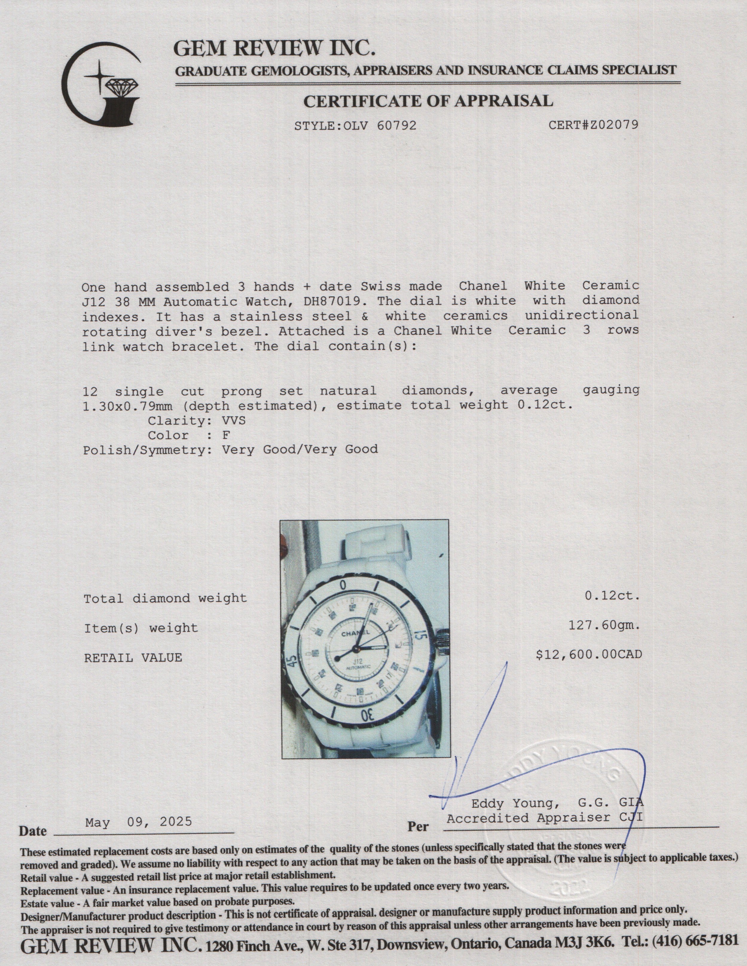 White Ceramic J12 38 MM Automatic Watch Diamond Dial w/ Box