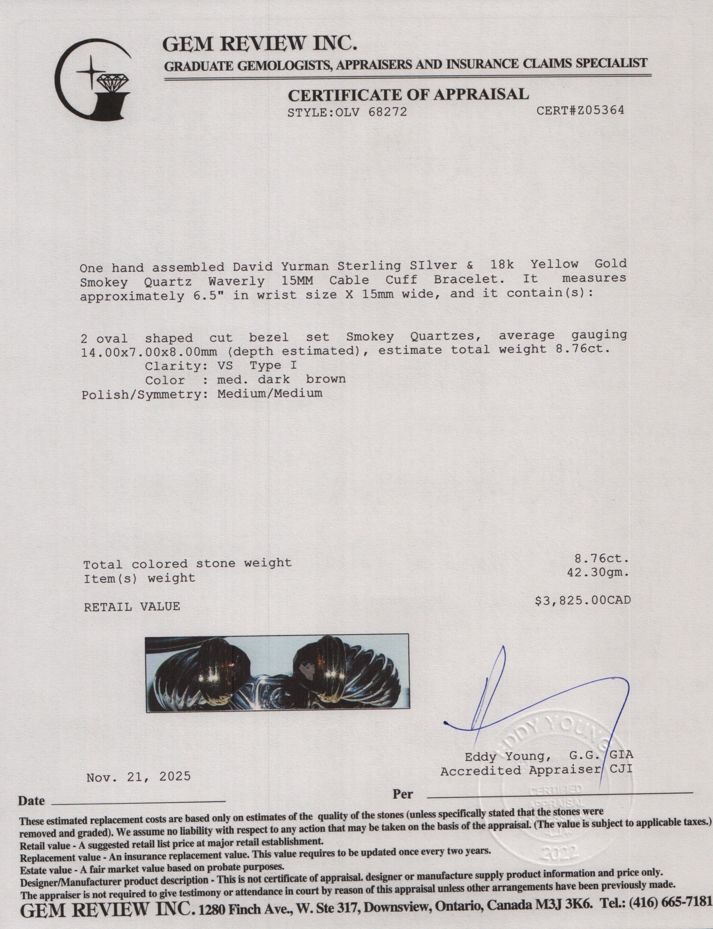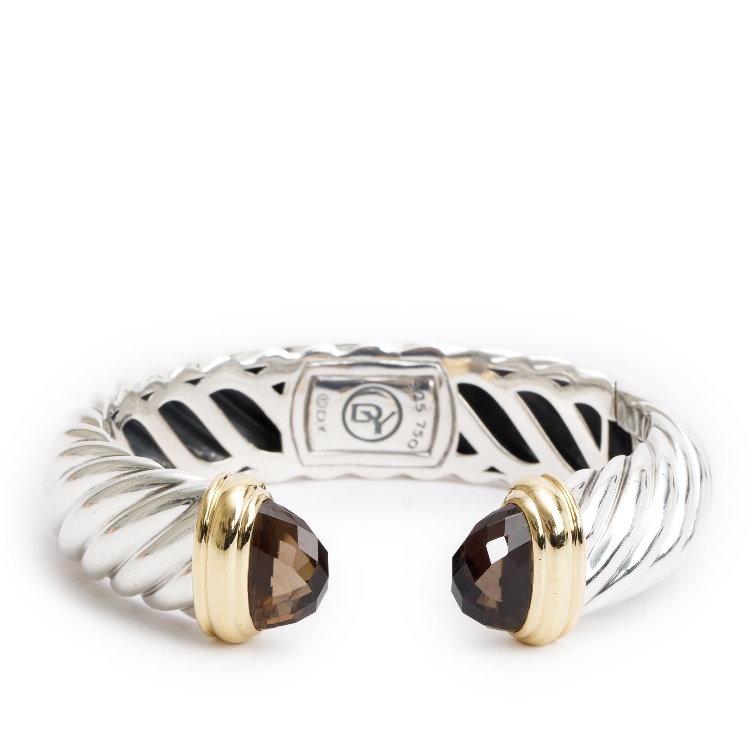 Sterling SIlver & 18k Yellow Gold Smokey Quartz Waverly 15 MM Cable Cuff Bracelet
