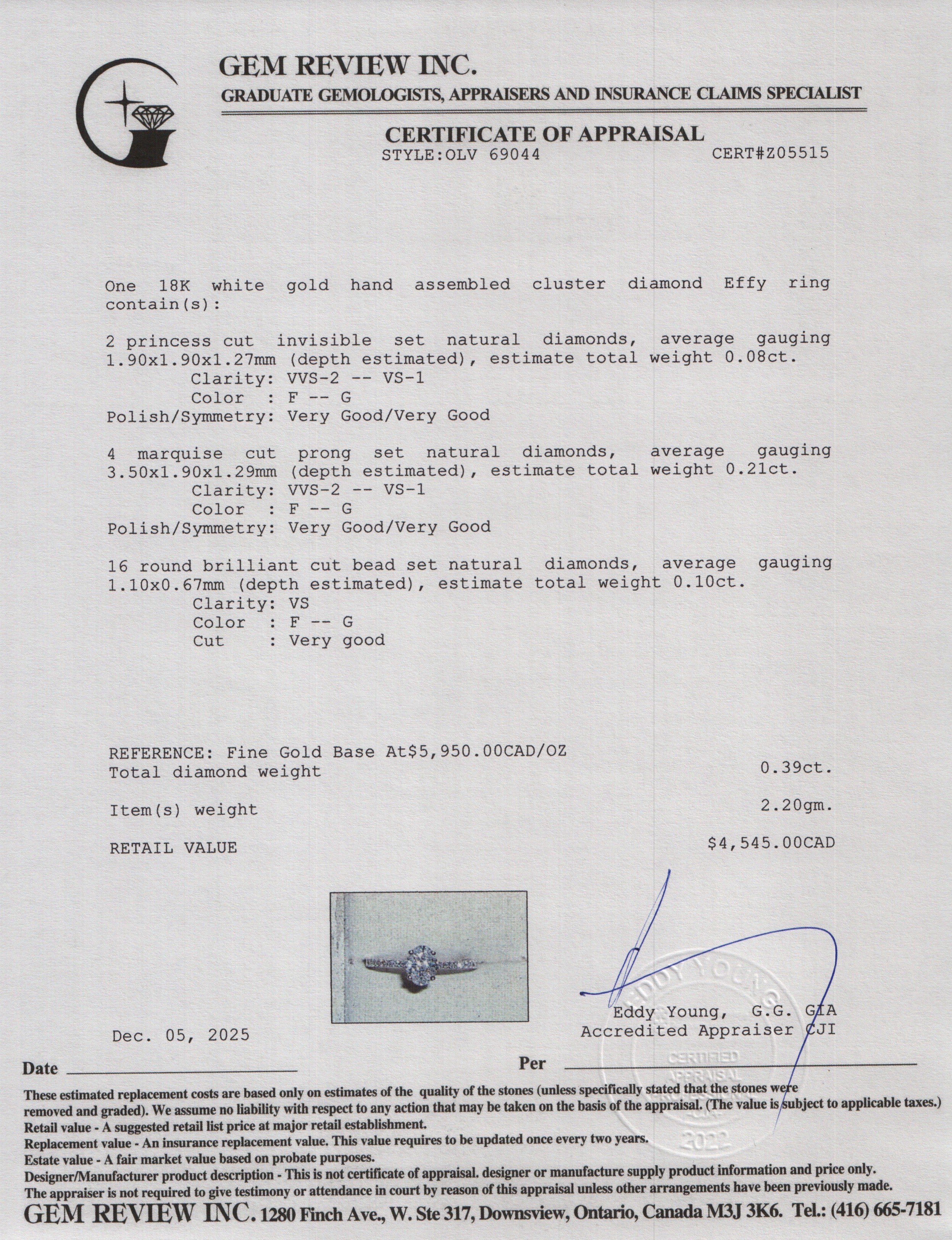 Effy 18k White Gold Cluster Diamond Engagement Ring, Size 7.5