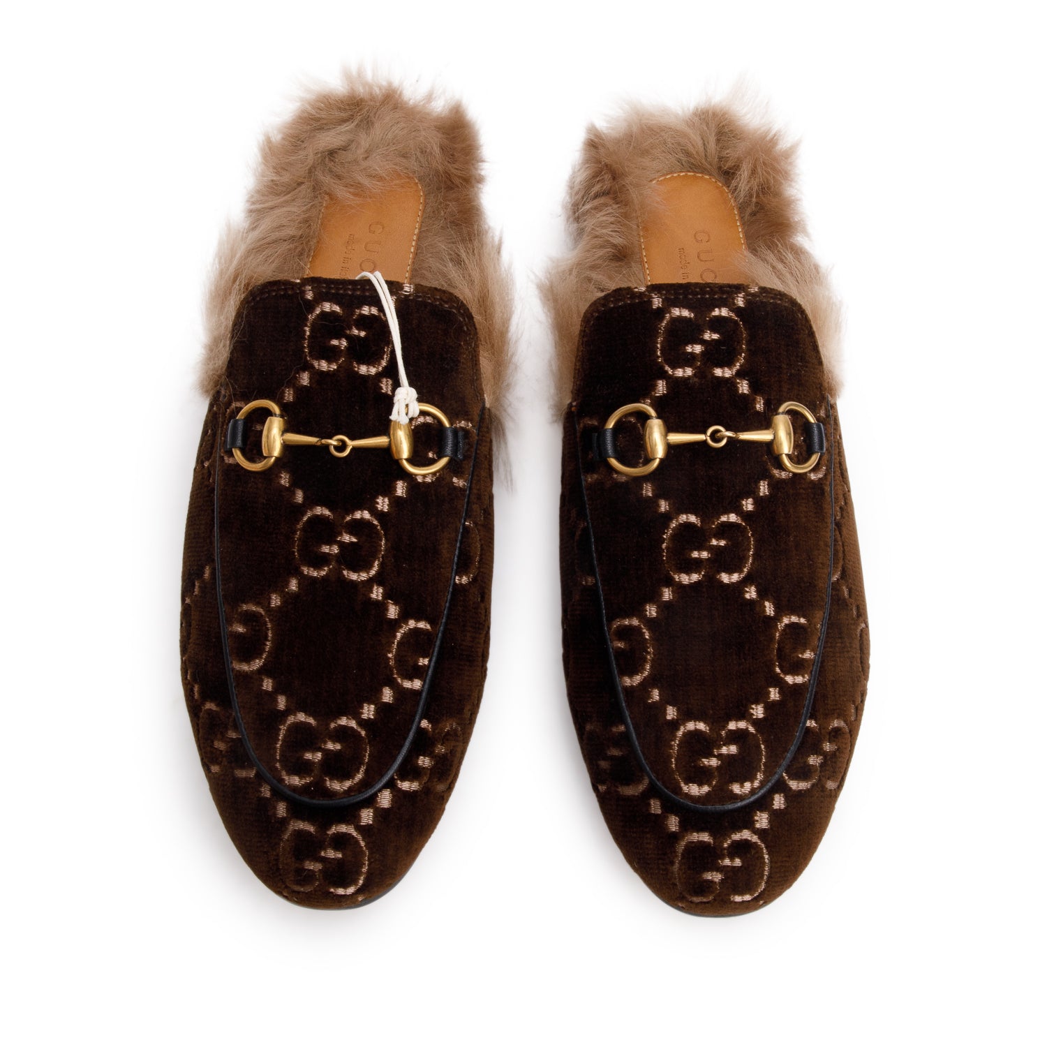 Brown Velvet GG Kid Fur Princetown Mules, Size 38 w/ Box