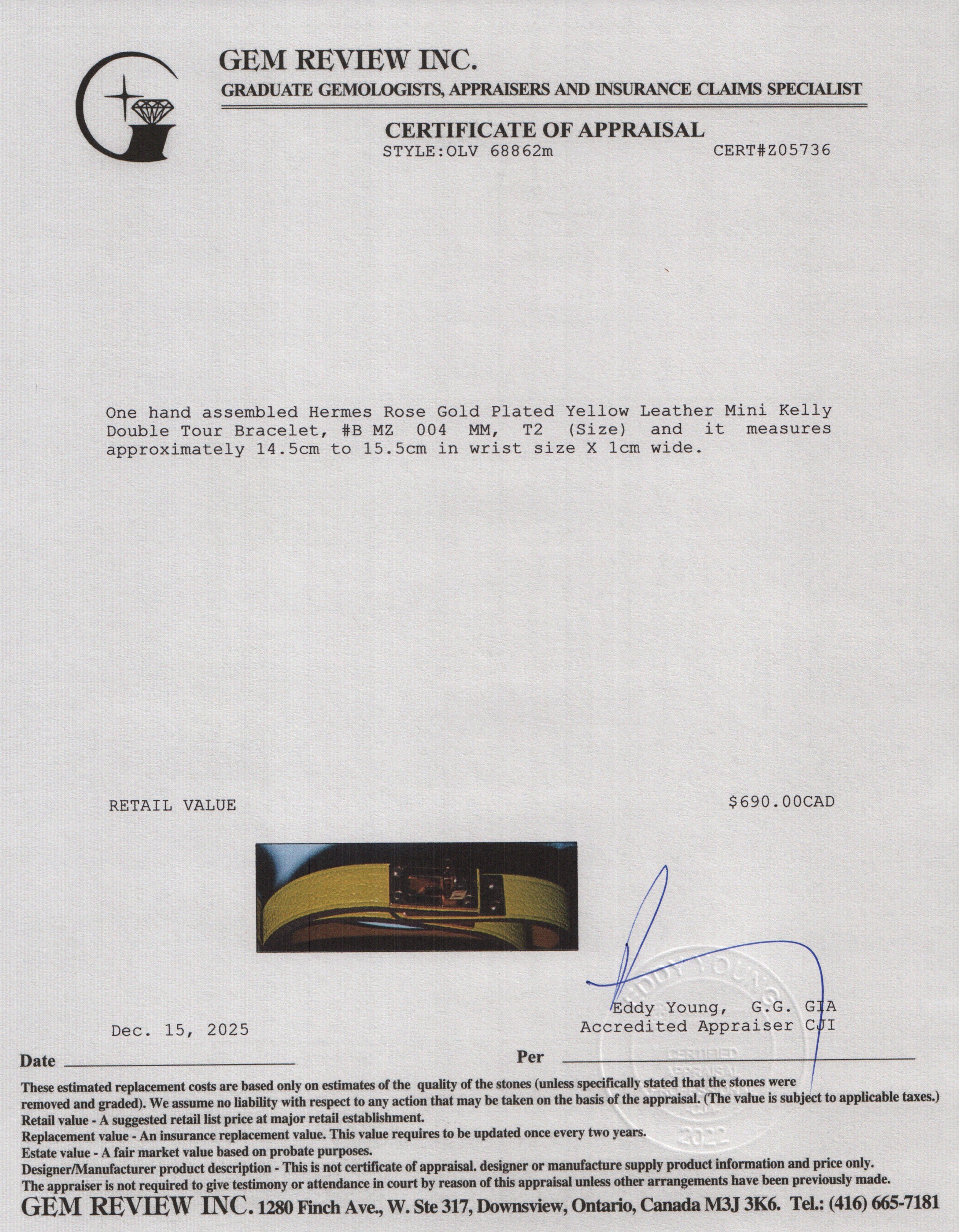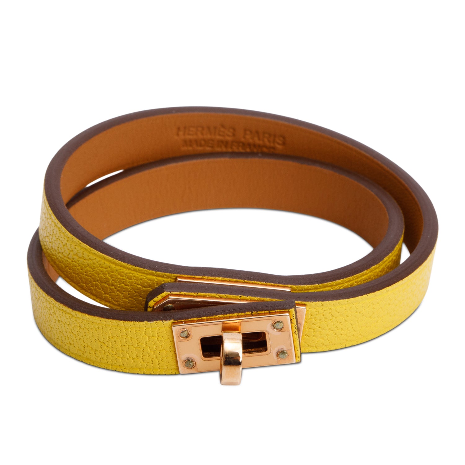 Rose Gold Plated Yellow Leather Mini Kelly Double Tour Bracelet, Size T2 w/ Box