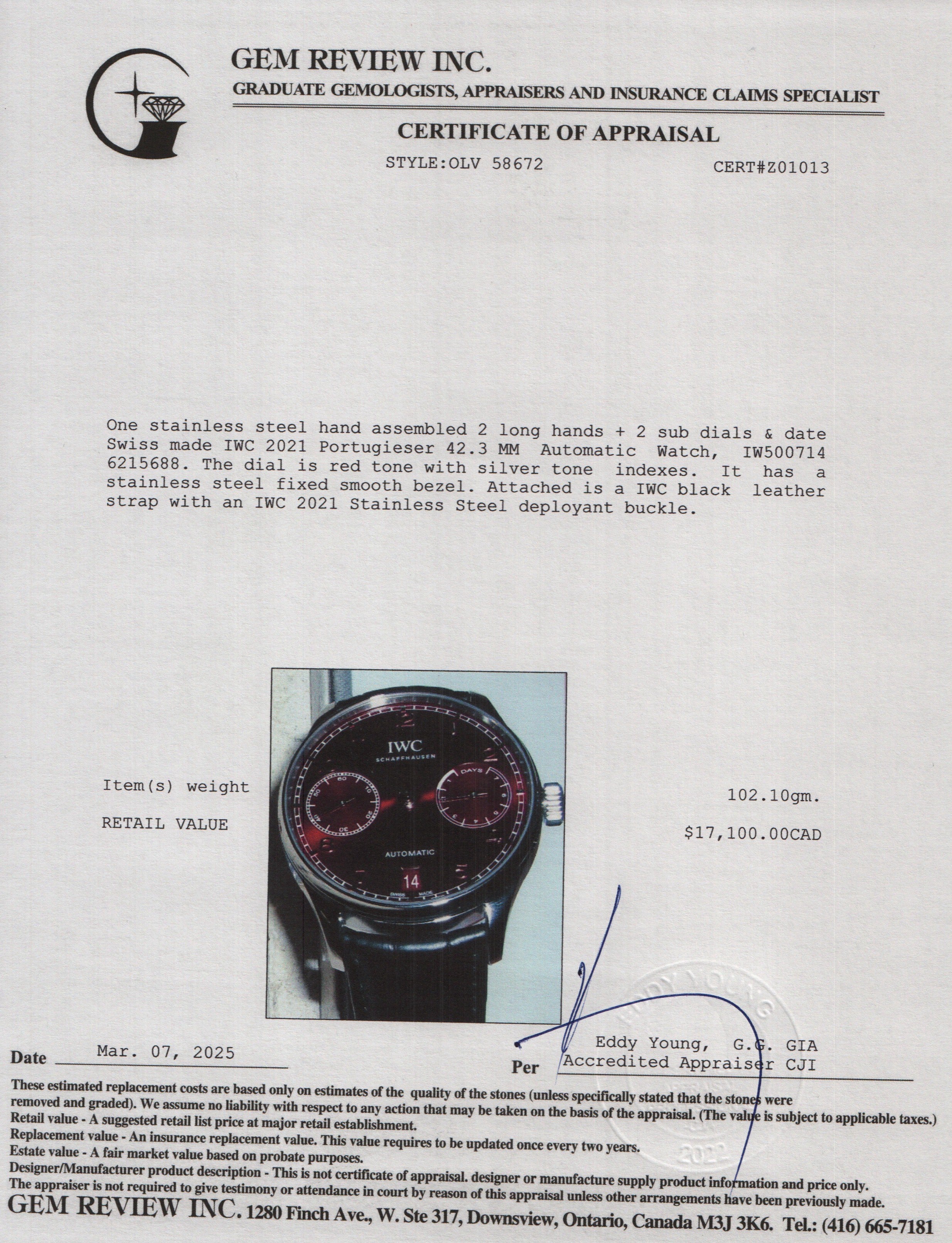 2021 Stainless Steel Portugieser 42.3 MM Automatic Watch Red Dial IW500714 w/ Box & Papers