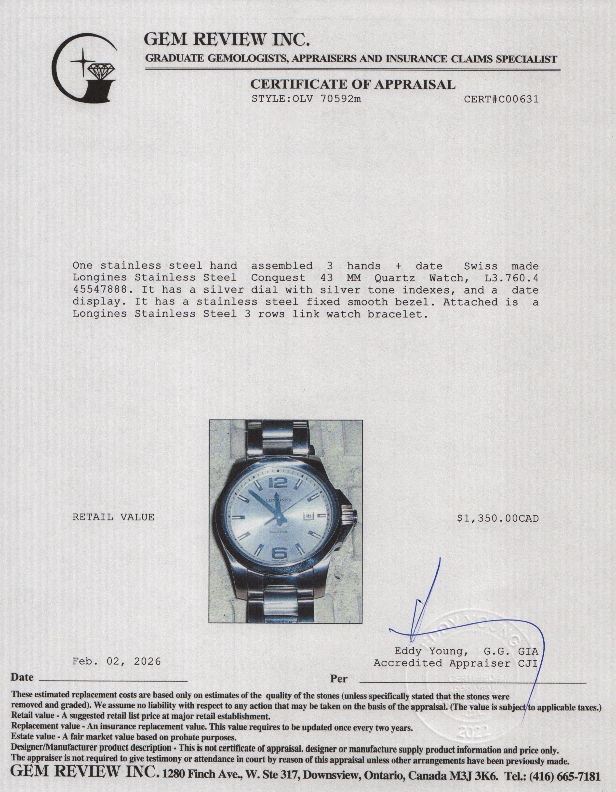 2021 Stainless Steel Conquest 43 MM Quartz Watch Silver Dial w/ Box & Papers