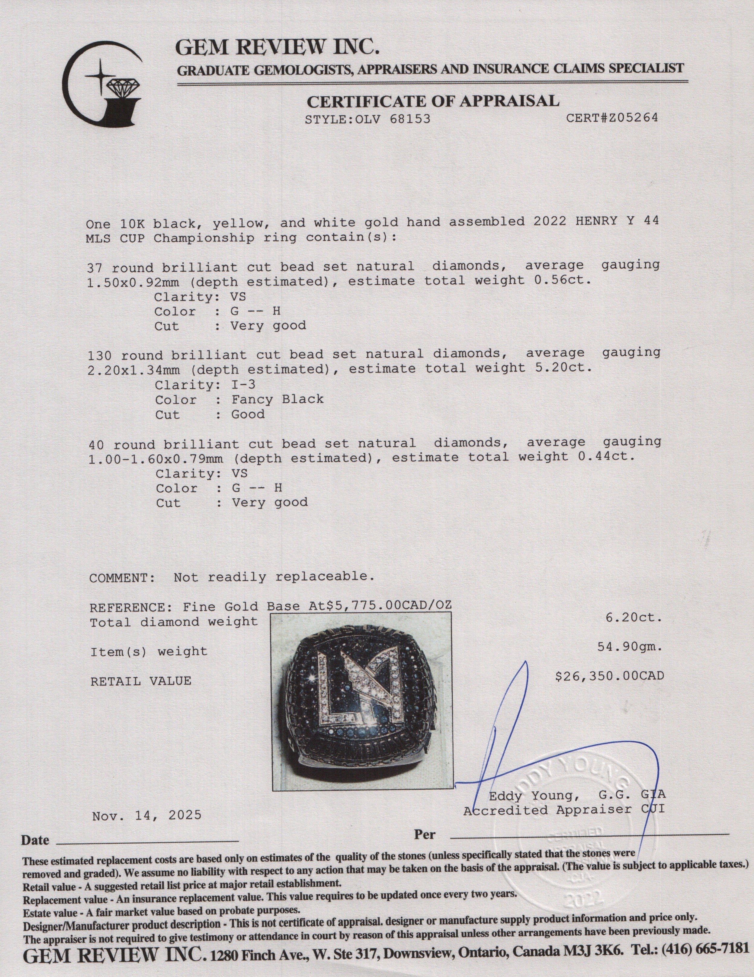 Los Angeles Football Club 2022 MLS Championship 10k Yellow & White Gold Diamond Ring, Size 12 w/ Box