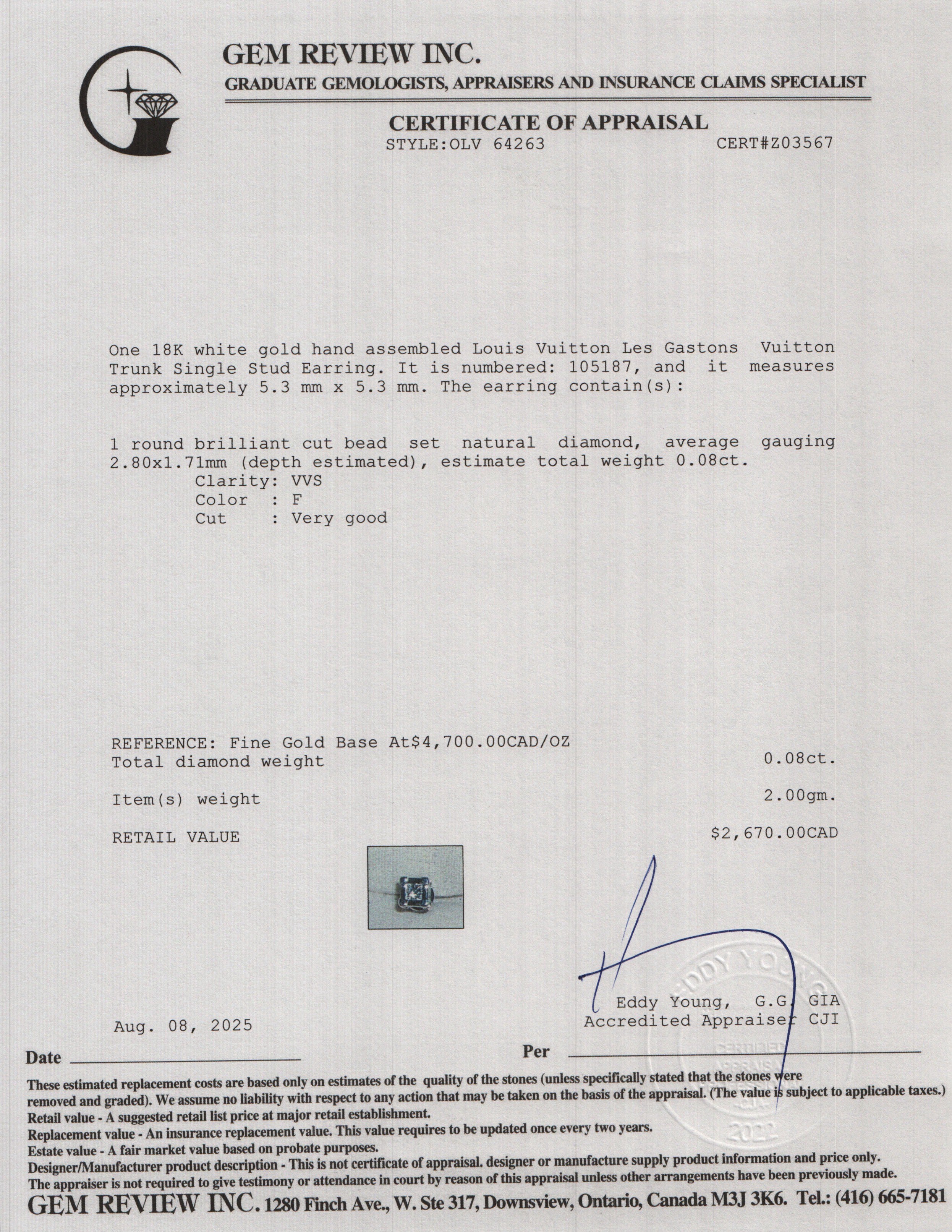 18k White Gold Diamond Les Gastons Vuitton Trunk Single Stud Earring w/ Box