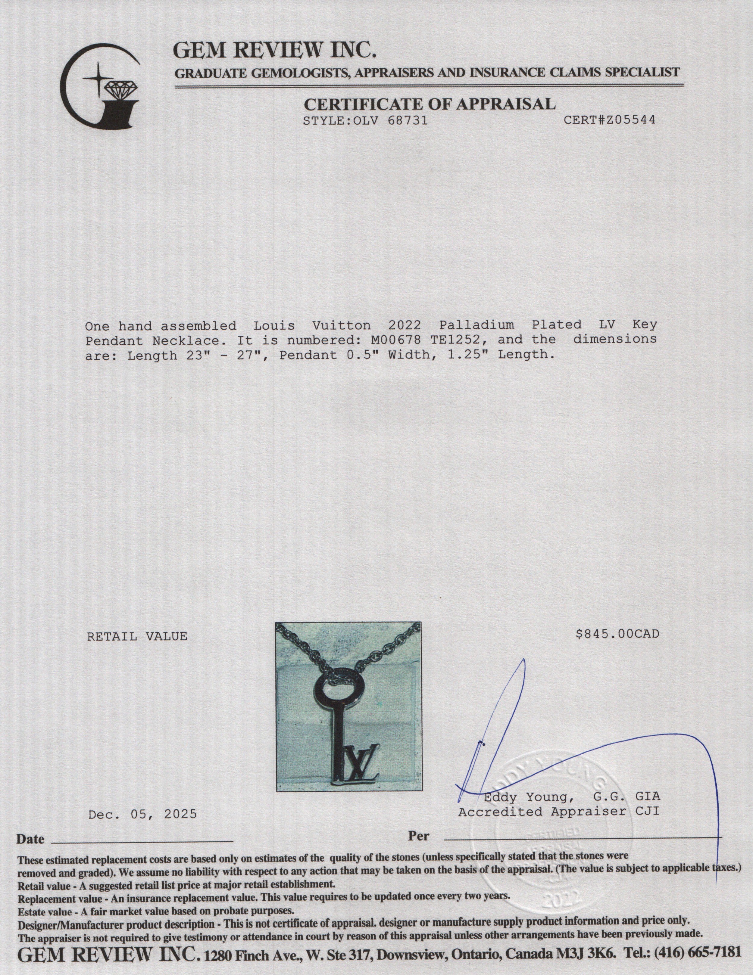 2022 Palladium Plated LV Key Pendant Necklace w/ Box