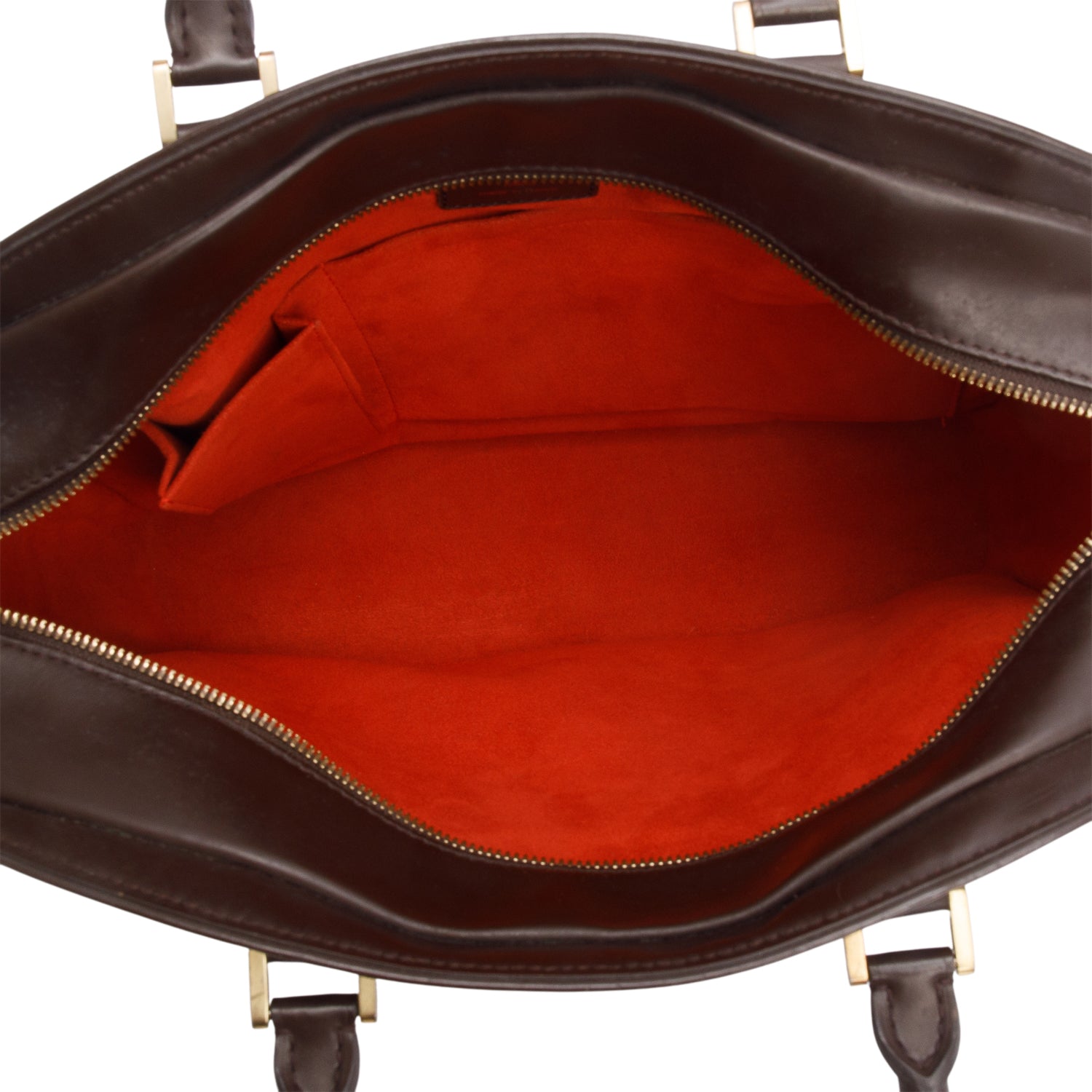 Condition: Very Good; slight scratches and tarnishing at hardware; slight marks and creasing at exterior leather trim; clean interior