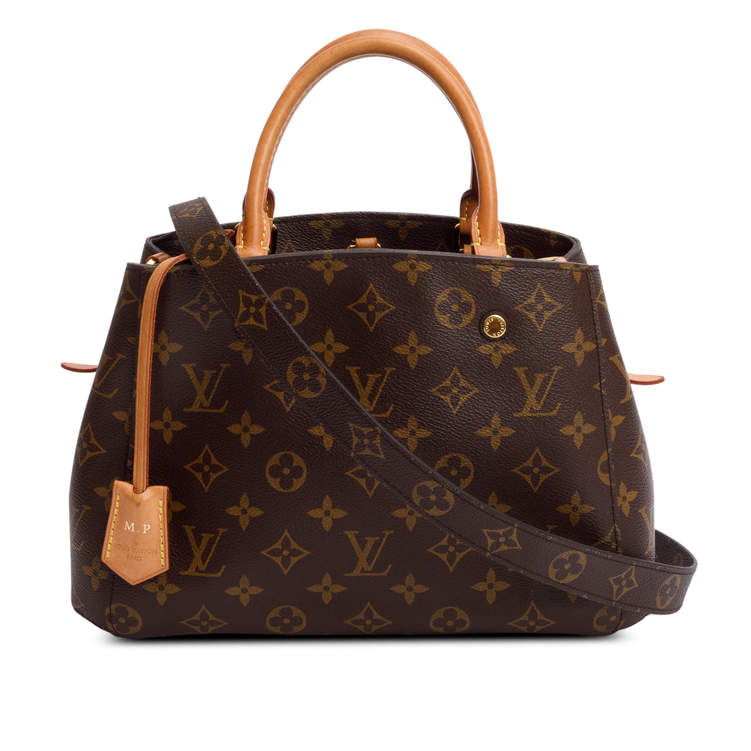 Condition: Very Good; light surface scratches at hardware; slight marks and discolouration at exterior vachetta leather trim and handles; clean interior; initial 'M.P' hot stamped at clochette.