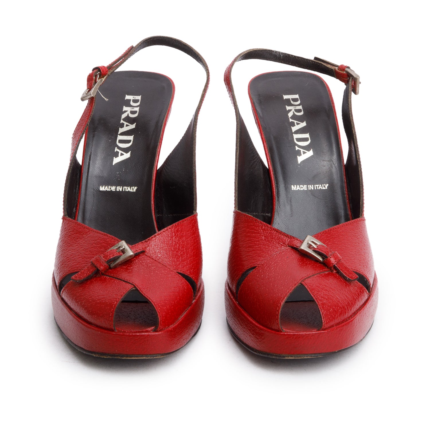 Condition: Very Good; sight tarnishing at hardware; slight wear at soles; some creasing at leather straps.