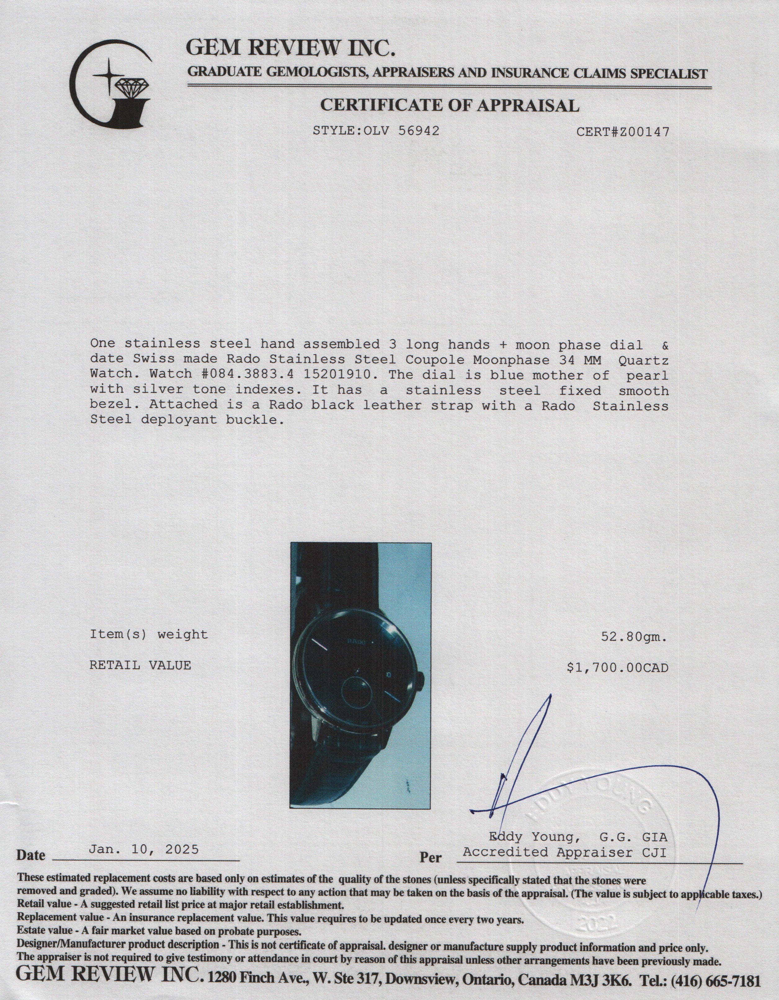 Stainless Steel Coupole Moonphase 34 MM Quartz Watch Blue Mother of Pearl Dial