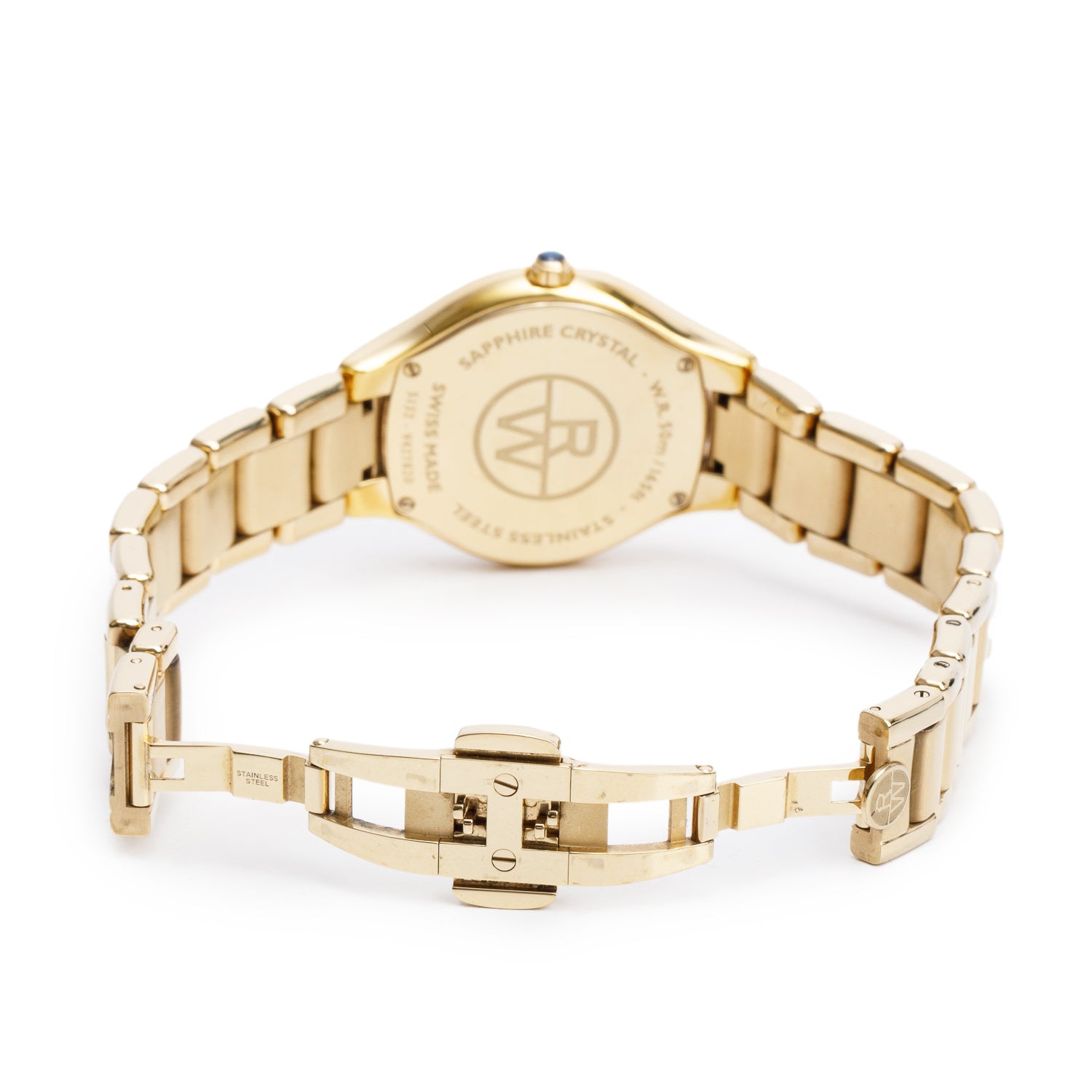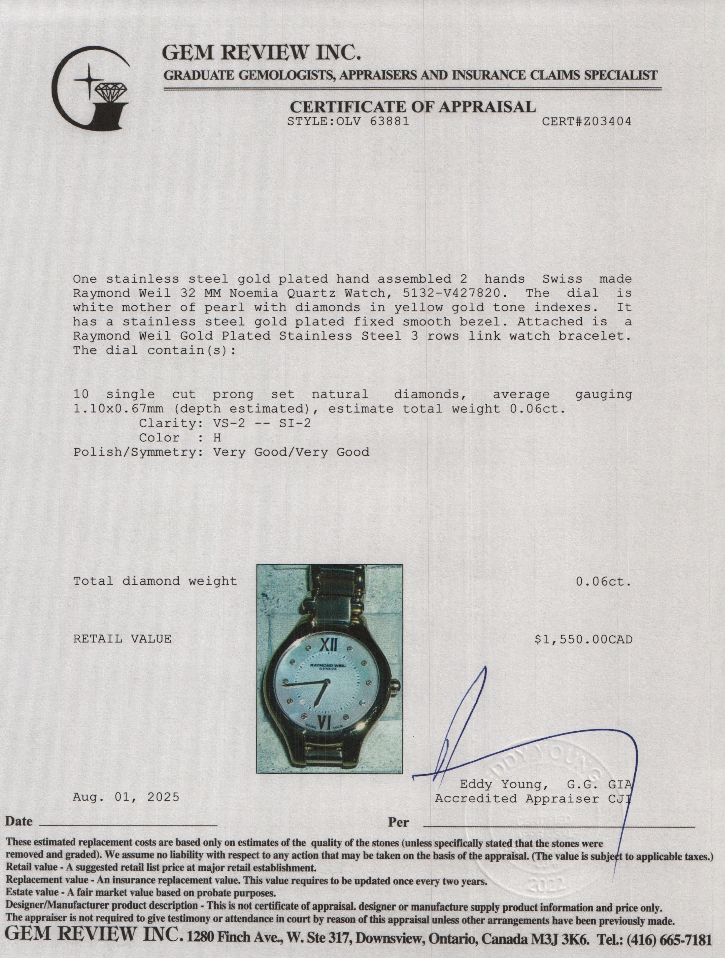 Gold Plated Stainless Steel 32 MM Noemia Quartz Watch Mother of Pearl Diamond Dial 5132 w/ Box & Papers