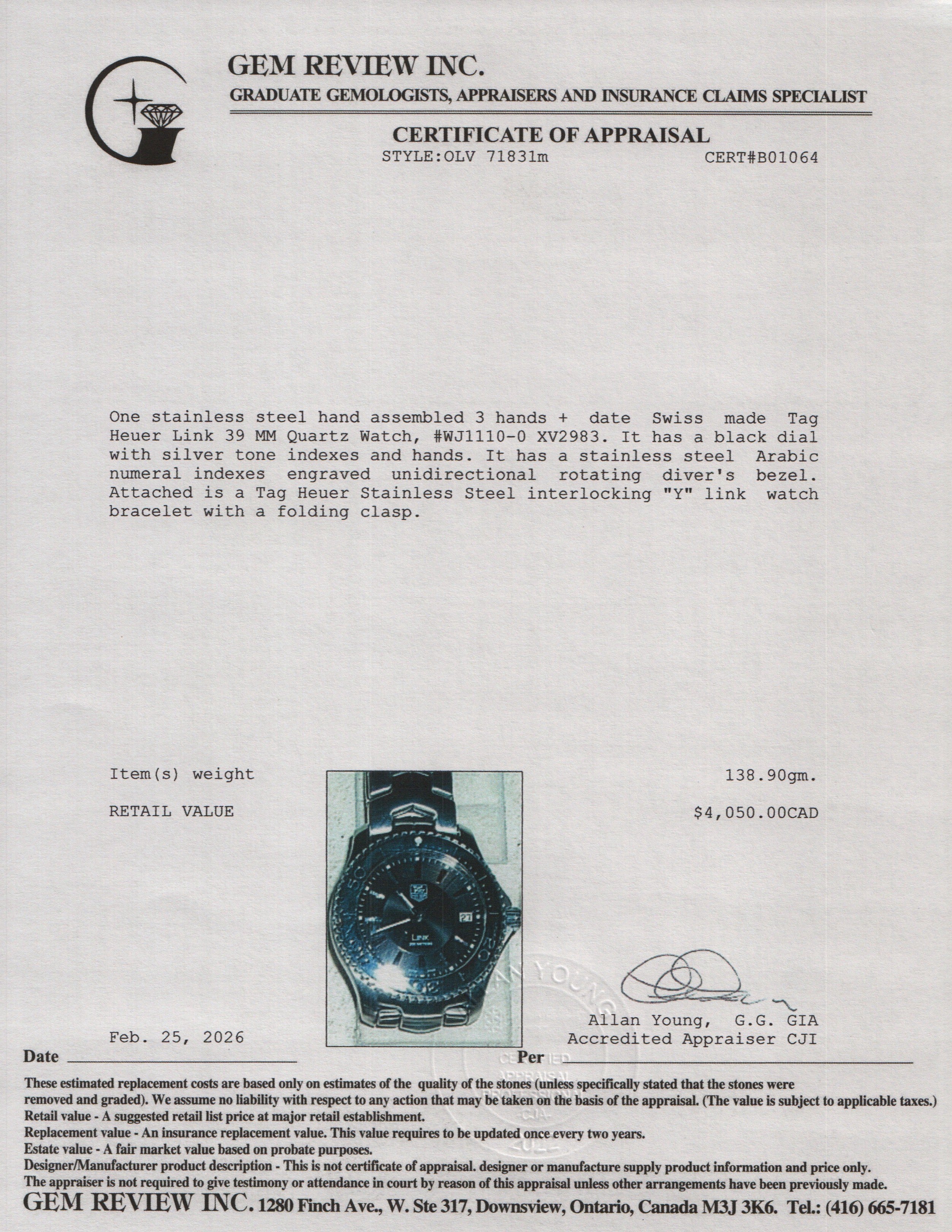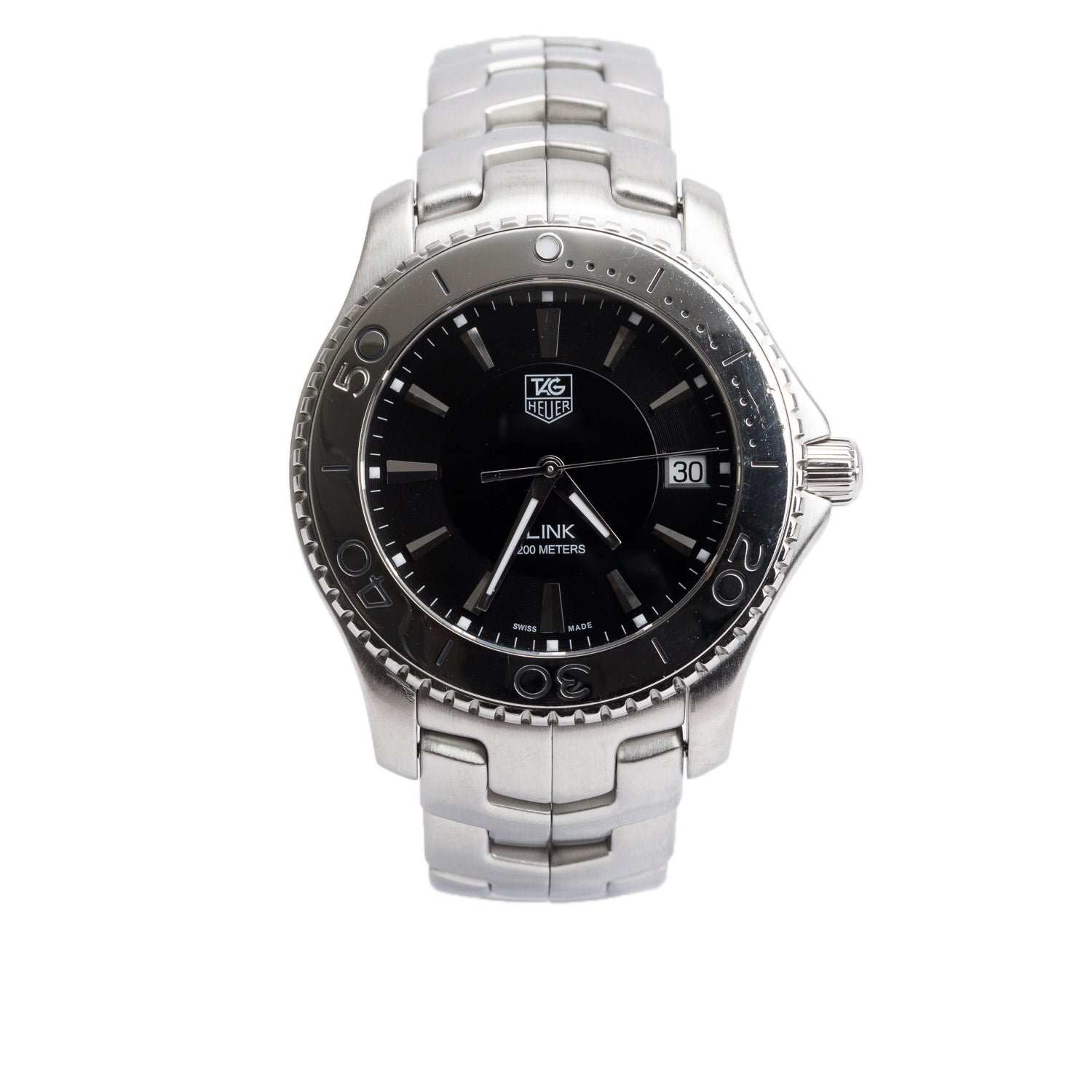Stainless Steel Link 39 MM Quartz Watch Black Dial WJ1110 w/ Box