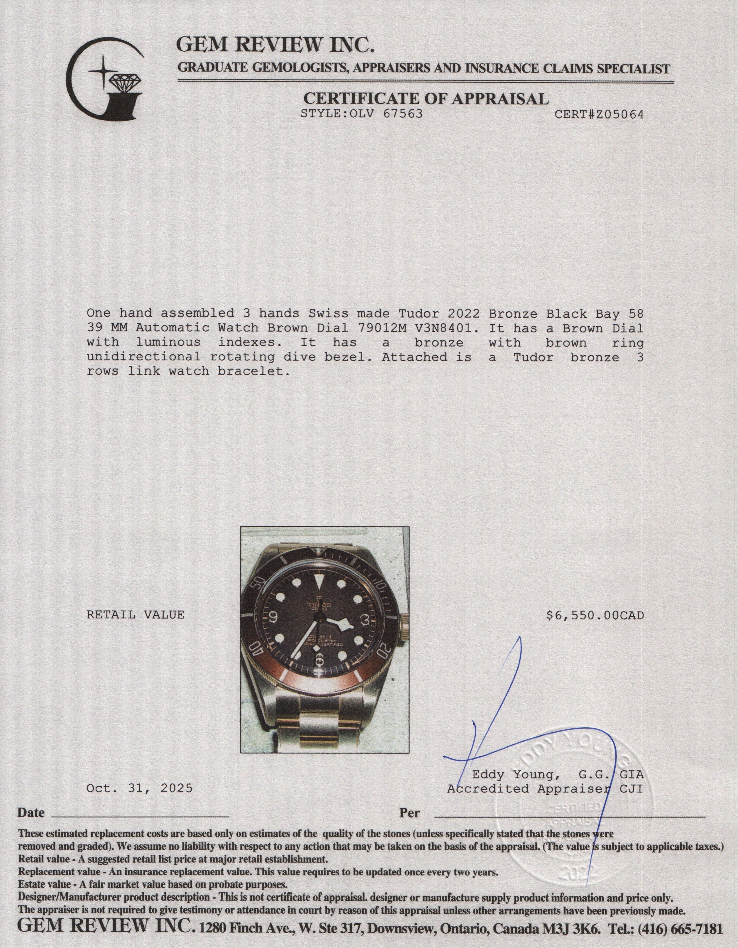 2022 Bronze Black Bay 58 39 MM Automatic Watch Brown Dial 79012M w/ Box, Papers & Extra Straps