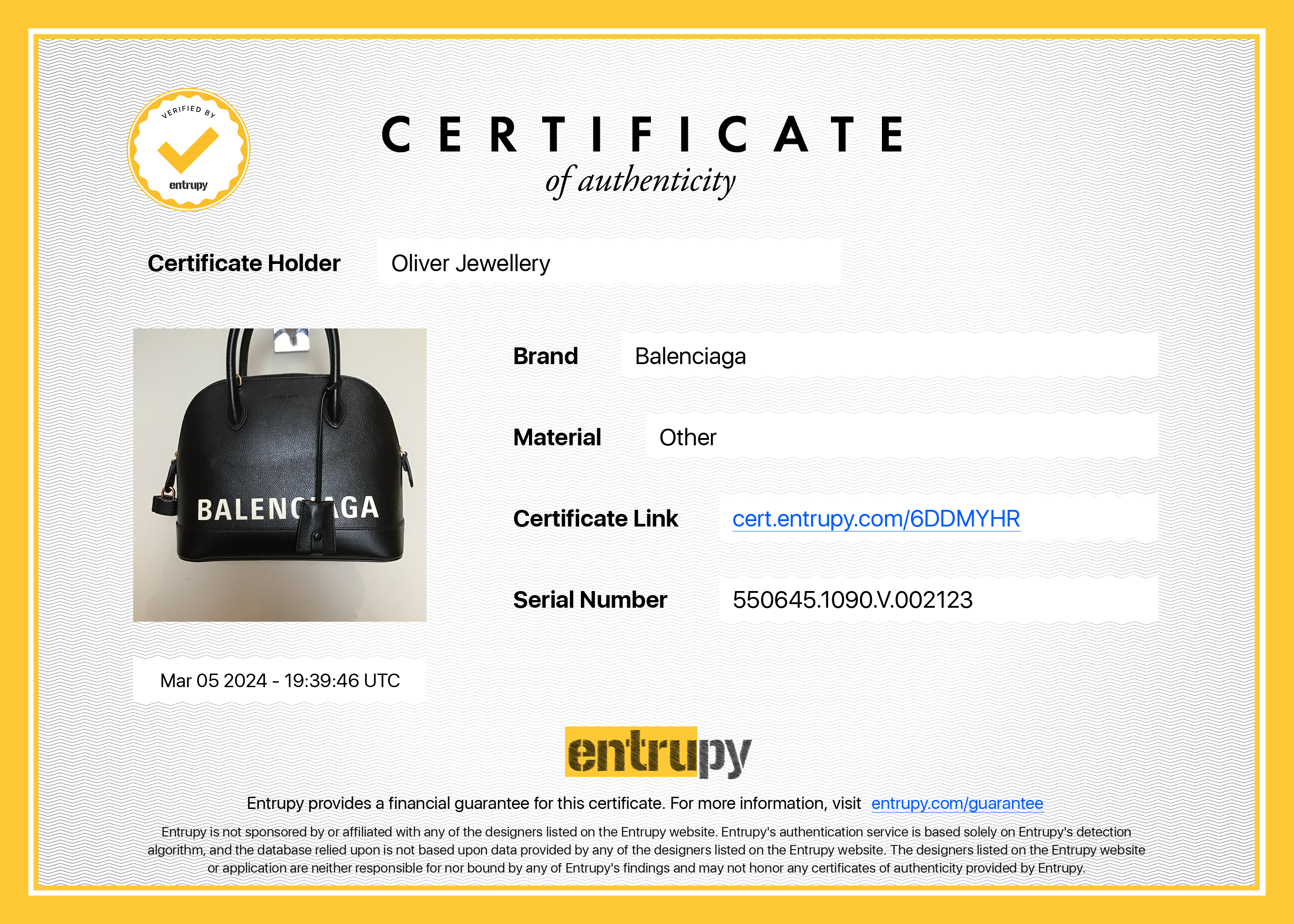 Dust Bag, Detachable Strap, Lock & Clochette with Keys, Entrupy Certificate of Authenticity